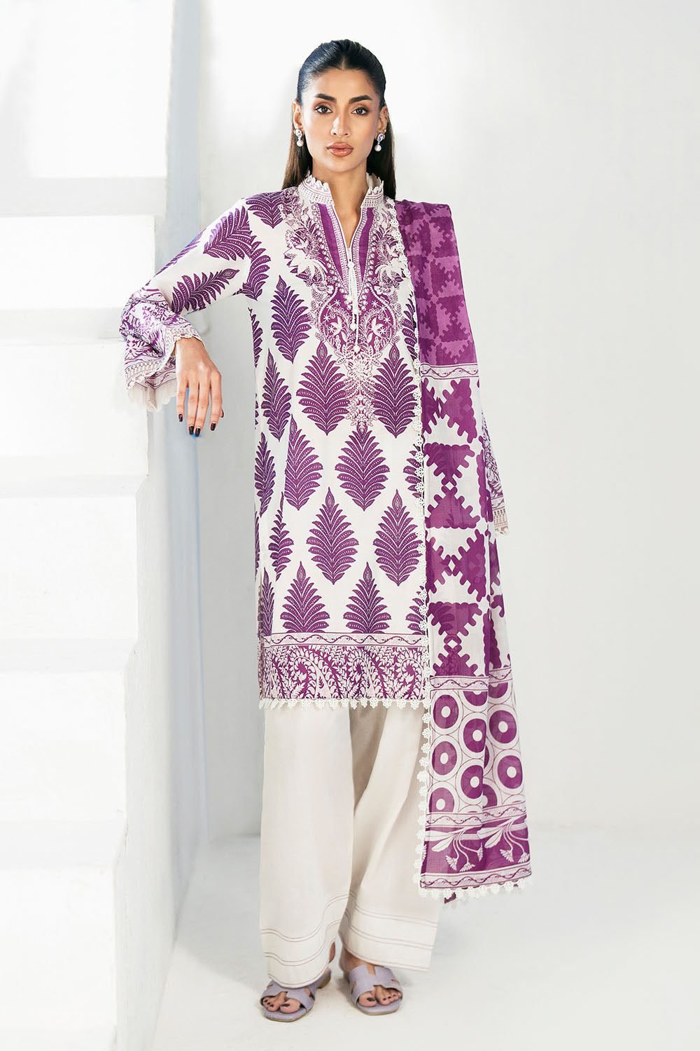 Step into a realm of timeless elegance with the Cl-62269, a masterpiece that celebrates the rich textile heritage of the Indian subcontinent. At the heart of this ensemble is the premium lawn fabric—a material that rose to prominence for its unparalleled breathability and silk-like finish, having been perfected over centuries in the legendary weaving hubs of Multan and Lahore. This three-piece suit features a mesmerizing deep purple and crisp white palette, evoking the regal splendor of Mughal courts while maintaining a contemporary edge. The shirt is adorned with meticulously printed botanical motifs, leading the eye down to the show-stopping embroidered organza border. Organza, known for its delicate translucency and firm structure, provides a sophisticated contrast to the soft lawn, adding a touch of ethereal grace to the hemline. The embroidery on the organza is a tribute to traditional threadwork, featuring dense, rhythmic patterns that catch the light. The silhouette is a study in refined tailoring, featuring a sophisticated high-neck collar and elongated sleeves finished with delicate lace trimmings and flared cuffs that dance with every movement. For a grand occasion such as an Eid celebration or an intimate Nikkah ceremony, style this ensemble with oversized silver jhumkas and a pair of ivory silk khussas. The dupatta, featuring bold geometric and floral patterns, can be draped over one shoulder to showcase the intricate embroidery of the shirt. The trousers are cut in a contemporary straight-leg fit with subtle pleat detailing at the hem, offering a balanced contrast to the detailed shirt. This outfit is more than just attire; it is a canvas of cultural storytelling, blending artisanal precision with modern silhouettes to ensure you stand out at any festive gathering.