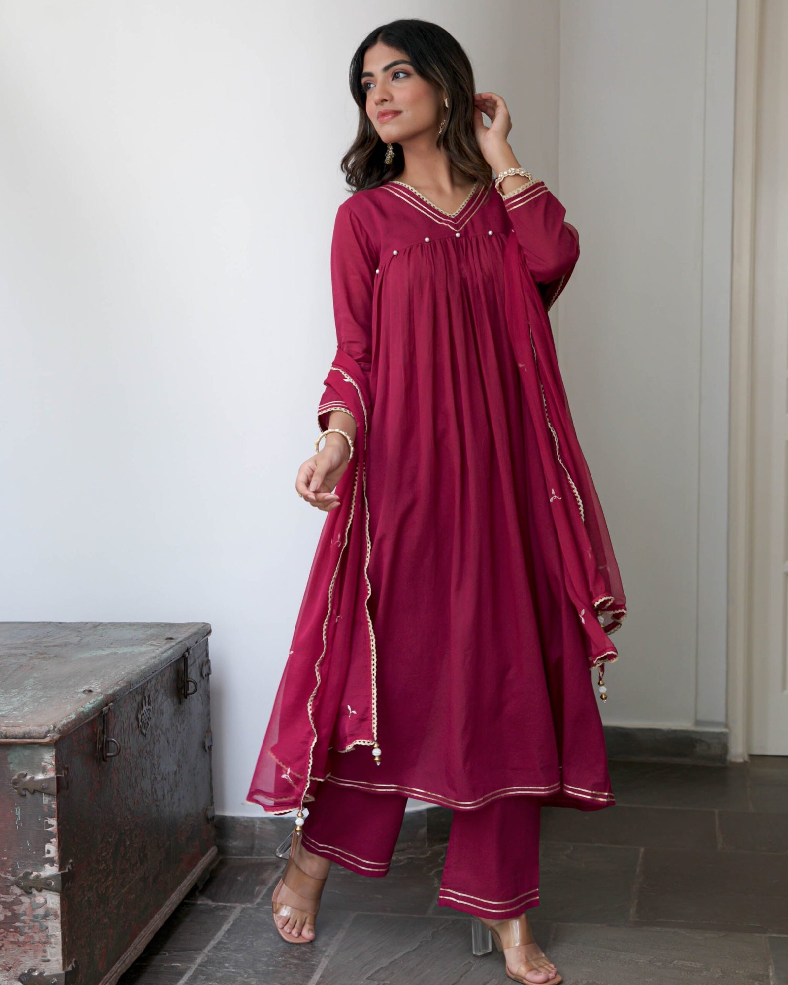 Step into a realm of timeless regality with the Aarohi Cotton Suit Set, a masterpiece that pays homage to the rich sartorial heritage of Rajasthan. This ensemble is meticulously crafted from the finest long-staple cotton, reminiscent of the legendary ‘Malmal’ that once graced the courts of Indian royalty for its breathability and soft hand-feel. The deep, jewel-toned wine hue serves as a majestic canvas for the exquisite Gota Patti work—a traditional craft originating from the 16th century—where ribbons of gold and silver are skillfully appliquéd to create intricate geometric patterns. The kurta features a sophisticated empire-line silhouette, where delicate gathers erupt from a hand-beaded yoke adorned with luminous pearls and shimmering Zari borders. The V-neckline is framed with multiple rows of golden lace, drawing the eye to the artisanal precision of the garment. The voluminous flare of the kurta provides a majestic movement, perfectly complemented by straight-cut trousers that feature matching gold accents at the hem. To complete the look, the set includes a diaphanous dupatta with scalloped edges and playful bead hangings, adding a layer of ethereal grace. For a grand wedding reception or a festive Diwali gala, style this ensemble with oversized gold Jhumkas, a stack of temple-work bangles, and embellished mojris. The Aarohi set is not merely an outfit; it is a celebration of hand-crafted luxury, designed for the modern woman who cherishes her roots while embracing contemporary elegance. Its breathable yet structured fabric ensures you remain the epitome of poise from the first toast to the final dance.