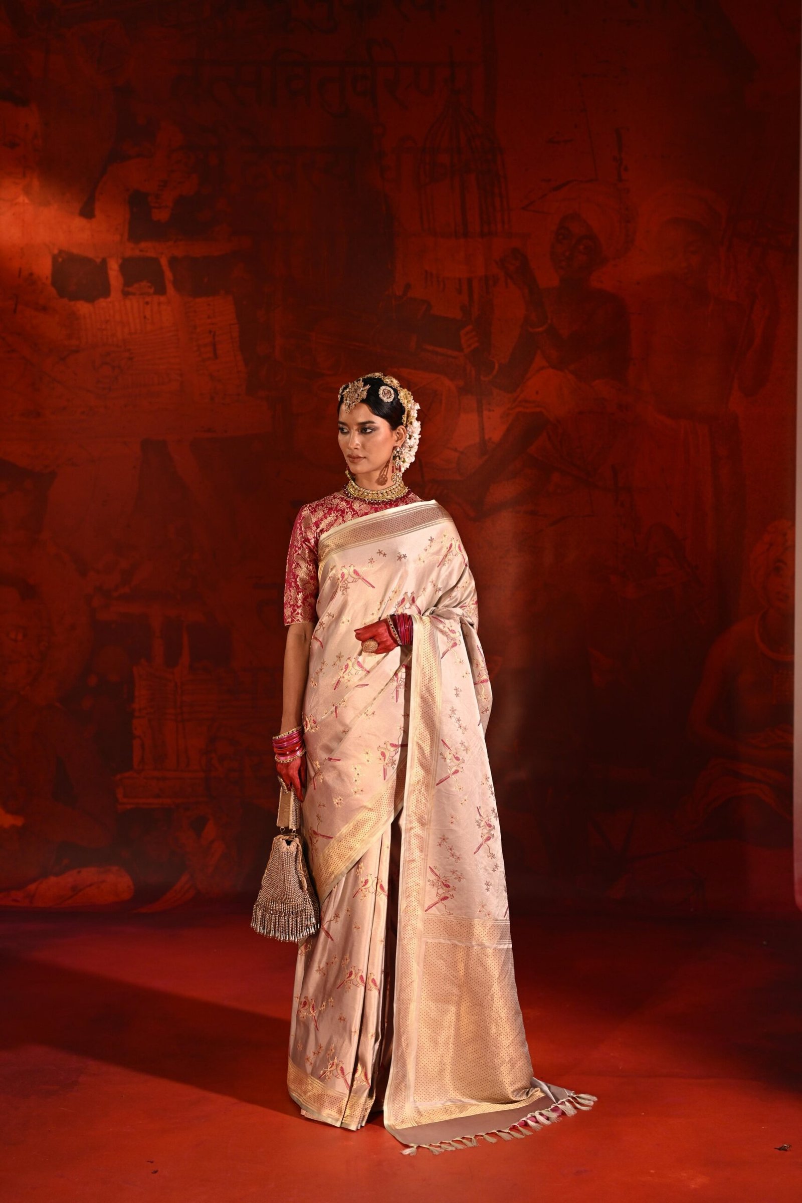 / Beige Satin Silk Saree With Pink Meena Motifs & Zari Border