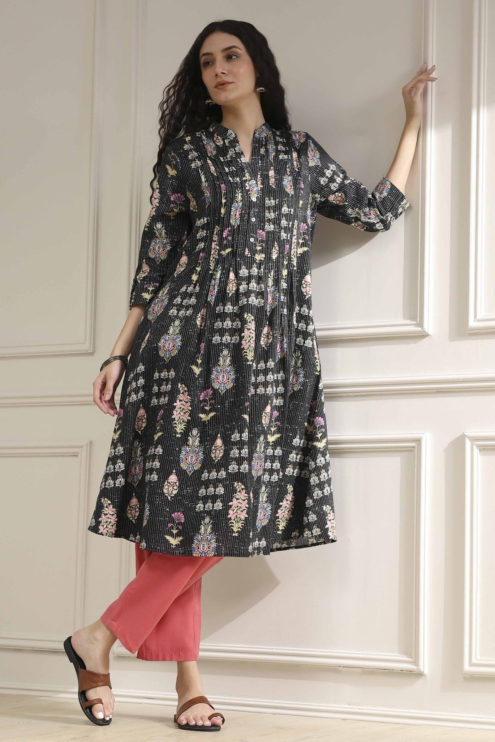 Discover the perfect harmony of heritage and contemporary flair with our Black Cotton Printed A-line Kurta. This piece is a celebration of the ‘Chintz’ and block-printing legacies that have defined the textile history of the Indian subcontinent for generations. Set against a deep, midnight-black backdrop, the garment features a sophisticated play of vertical pinstripes and vibrant floral ‘Butis’ in shades of coral, azure, and gold—a palette that evokes the lush gardens of the Deccan. The fabric is a premium, breathable cotton, chosen for its soft hand-feel and its ability to hold the intricate details of the artisanal prints. The silhouette is a masterclass in tailoring, featuring a flattering A-line flare that begins from a meticulously pleated bodice. This structural detail adds a sense of volume and rhythmic movement, reminiscent of the traditional ‘Anarkali’ but with a modern, streamlined twist. The mandarin collar and buttoned placket lend a refined, formal edge, while the three-quarter sleeves make it versatile for all-day wear. To style this for a grand festive lunch or a sophisticated cultural event, pair it with contrast-colored straight-fit trousers in a bold coral hue to pull out the accents of the print. Accessorize with heavy oxidized silver necklaces and a statement cocktail ring to lean into a bohemian-luxe aesthetic. Complete the ensemble with leather kolhapuris or block-heeled sandals. This kurta is not just a garment; it is a wearable piece of art that honors the enduring spirit of South Asian hand-craftsmanship.