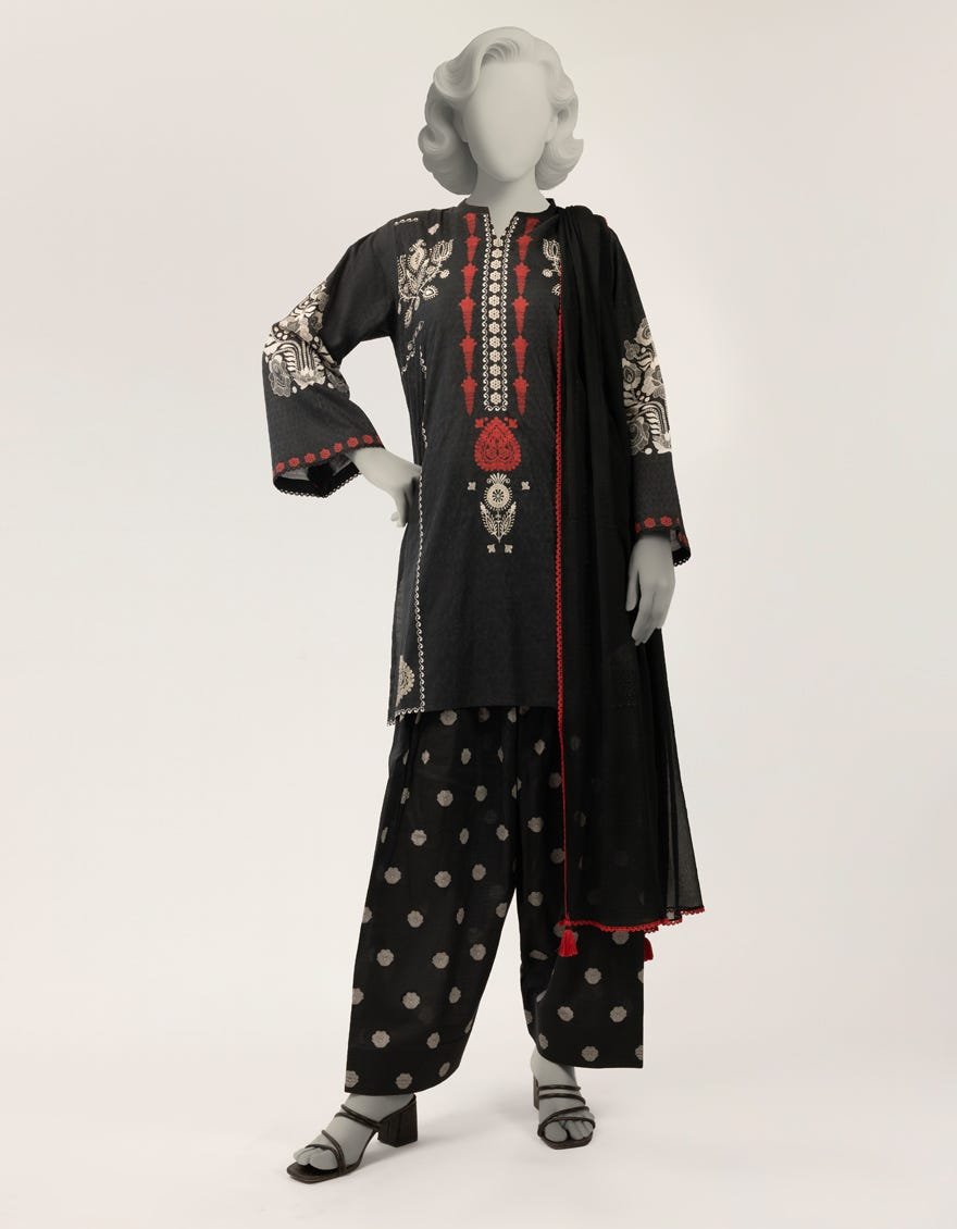 Embrace the timeless allure of the Black Dobby Digital Printed Stitched 3-piece ensemble, a garment that serves as a bridge between the storied past of South Asian textile arts and the precision of modern craftsmanship. The foundation of this masterpiece is the Dobby weave—a historical technique where the loom is manipulated to create small, repeated geometric patterns, adding a sophisticated textural depth that standard flat weaves lack. This tactile surface provides the perfect stage for the high-definition digital print, which draws inspiration from the bold, symmetrical motifs found in traditional architectural carvings and ancient tapestry designs. The color palette is a striking study in contrasts; the obsidian black base is electrified by ivory and deep crimson accents, creating a visual narrative of power and grace. The kurta’s silhouette is a refined straight cut, meticulously tailored to offer a flattering drape that honors the classic Kameez. The sleeves are adorned with intricate borders that lead to a digital interpretation of hand-blocked motifs, while the neckline features a commanding placket design that elongates the frame. This set is paired with playful yet elegant trousers featuring a classic ‘boti’ print—a nod to the enduring popularity of polka dots in vintage subcontinental fashion. To complete the look, the fluid black dupatta features a delicate red lace trim, adding a final touch of artisanal finesse. For grand occasions such as a winter wedding or a festive dholki, style this outfit with heavy oxidized silver jewelry, a bold red lip, and traditional velvet khussas. This ensemble isn’t just clothing; it is a curated experience of heritage and style, designed to make a statement of understated luxury at every festive gathering.
