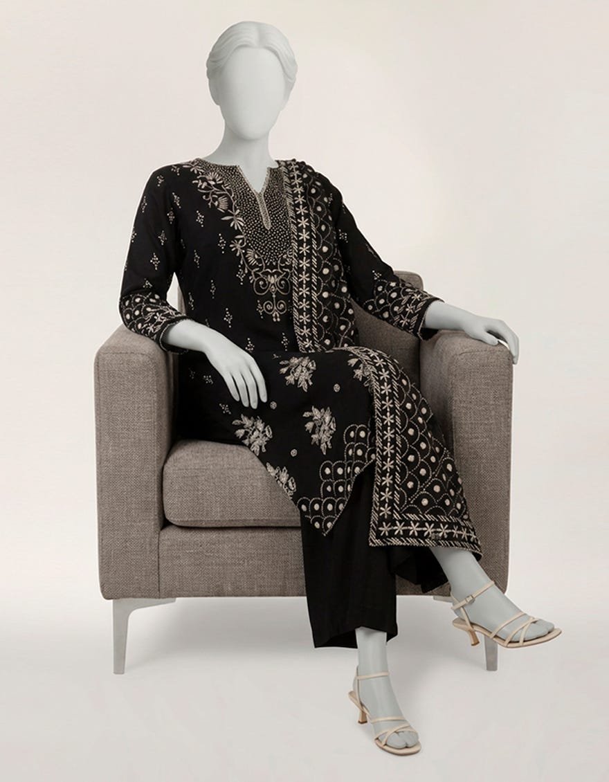 Step into the shadows of nocturnal elegance with the Black Maple Silk Dyed Stitched 3pc, an ensemble designed for the grandest of evening soirées. Maple Silk, a contemporary evolution of traditional silk weaves, offers a liquid-like drape and a subtle, pearlescent sheen that captures light with every movement. This three-piece set is a tribute to the Mughal era’s obsession with floral symmetry and the art of ‘Zardosi’ and ‘Resham’ work. The long-line shirt is adorned with a constellation of cream and gold embroidery that cascades down the neckline in a V-shaped vine, framing the face with artisanal brilliance. The sleeves and the side panels are enriched with dense, geometric borders that echo the architectural wonders of Lahore’s fort. The silhouette is designed to elongate the frame, featuring a high-slit shirt paired with perfectly tailored, straight-fit trousers that provide a structured counterpoint to the flowing top. The pièce de résistance is the dupatta, featuring a wide, ornate border that mimics the ‘Gota’ work of Rajasthan, allowing for a majestic drape over the shoulder or a regal ‘Nawaabi’ style carry. To style this for a wedding reception or a Baraat, opt for a sleek, low bun adorned with fresh jasmine (Gajras), deep kohl-rimmed eyes, and heritage Polki jewelry. This outfit is not merely clothing; it is a wearable piece of history, meticulously stitched to provide the modern woman with a sense of royal lineage and unparalleled sartorial confidence.