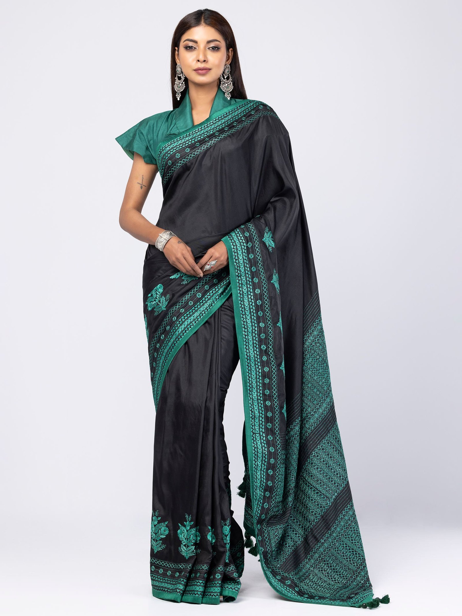 Step into the realm of wearable art with our Black Nakshi Kantha Embroidered Silk Saree, a masterpiece that celebrates one of Bengal’s most intricate and storied needlecrafts. ‘Nakshi Kantha,’ a term derived from the Persian word for artistic patterns, evolved from a humble domestic craft into a sophisticated form of visual storytelling. This saree is crafted on a canvas of lustrous, midnight-black pure Bishnupuri silk, providing a high-sheen, luxurious backdrop that makes the embroidery truly pop. The artisanal hand-work features the iconic running stitch, meticulously executed in a vibrant teal-green thread to create elaborate floral ‘butas’ and geometric ‘par’ (border) patterns that take weeks of dedicated labor to complete. The embroidery is particularly dense along the borders and the sprawling pallu, which showcases a complex tapestry of folklore-inspired motifs and architectural lines. The texture of the silk is smooth and substantial, offering a structured silhouette that holds its shape beautifully, making it an ideal choice for the grand architecture of a winter wedding reception or a formal gala. To style this regal piece, opt for statement silver jhumkas and a heavy tribal choker to complement the teal accents. A sleek, center-parted bun and a bold emerald eye-look will heighten the dramatic contrast of the ensemble. The drape is elegant and heavy, with the embroidered pallu specifically designed to be pinned or left flowing to display the labor-intensive craftsmanship. This saree is not merely a garment; it is a heritage heirloom that bridges the gap between ancestral tradition and modern luxury fashion.