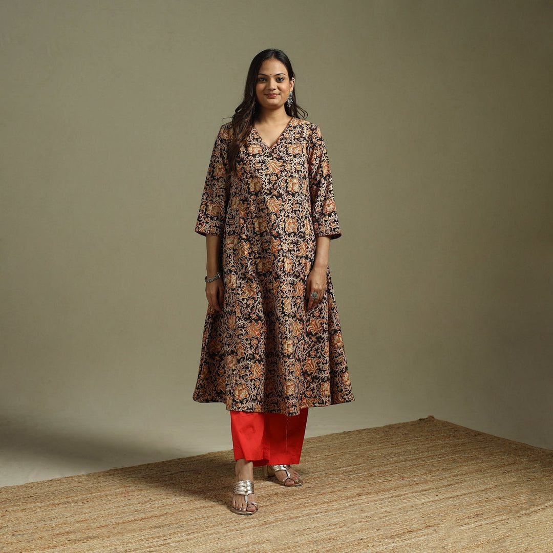 Embrace the regal allure of the Pedana heritage with our Black A-line Kalamkari Kurta, a garment that captures the very soul of Machilipatnam’s artisanal legacy. Pedana, the heartland of block-printed Kalamkari, is renowned for its intricate Persian-influenced motifs and the use of hand-carved teak wood blocks that impress life onto fabric. This kurta is crafted from premium natural cotton, treated with a milk and myrobalan wash to ensure the organic dyes bond with the fibers in a rich, permanent embrace. The deep black base, known as ‘Kaseesu,’ is achieved through a fermented mixture of iron scrap and jaggery, providing a dramatic canvas for the swirling ochre and terracotta floral vines. What elevates this piece to the pinnacle of luxury is the subtle hand-embroidery interspersed within the print, adding a three-dimensional tactile quality that catches the light beautifully. The silhouette is a majestic A-line with a generous flare, designed to create a sense of movement and grace as you navigate grand wedding halls or festive gatherings. The V-neckline and three-quarter sleeves offer a refined, elongated look that balances the volume of the skirt. For a high-octane wedding look, pair this masterpiece with the included fire-engine red trousers to create a bold color-block effect. Accessorize with antique gold temple jewelry or a Polki choker and gold-toned mojaris. This kurta is not merely an outfit; it is a wearable piece of history, designed for the discerning woman who appreciates the laborious journey from a hand-carved block to a finished couture silhouette.