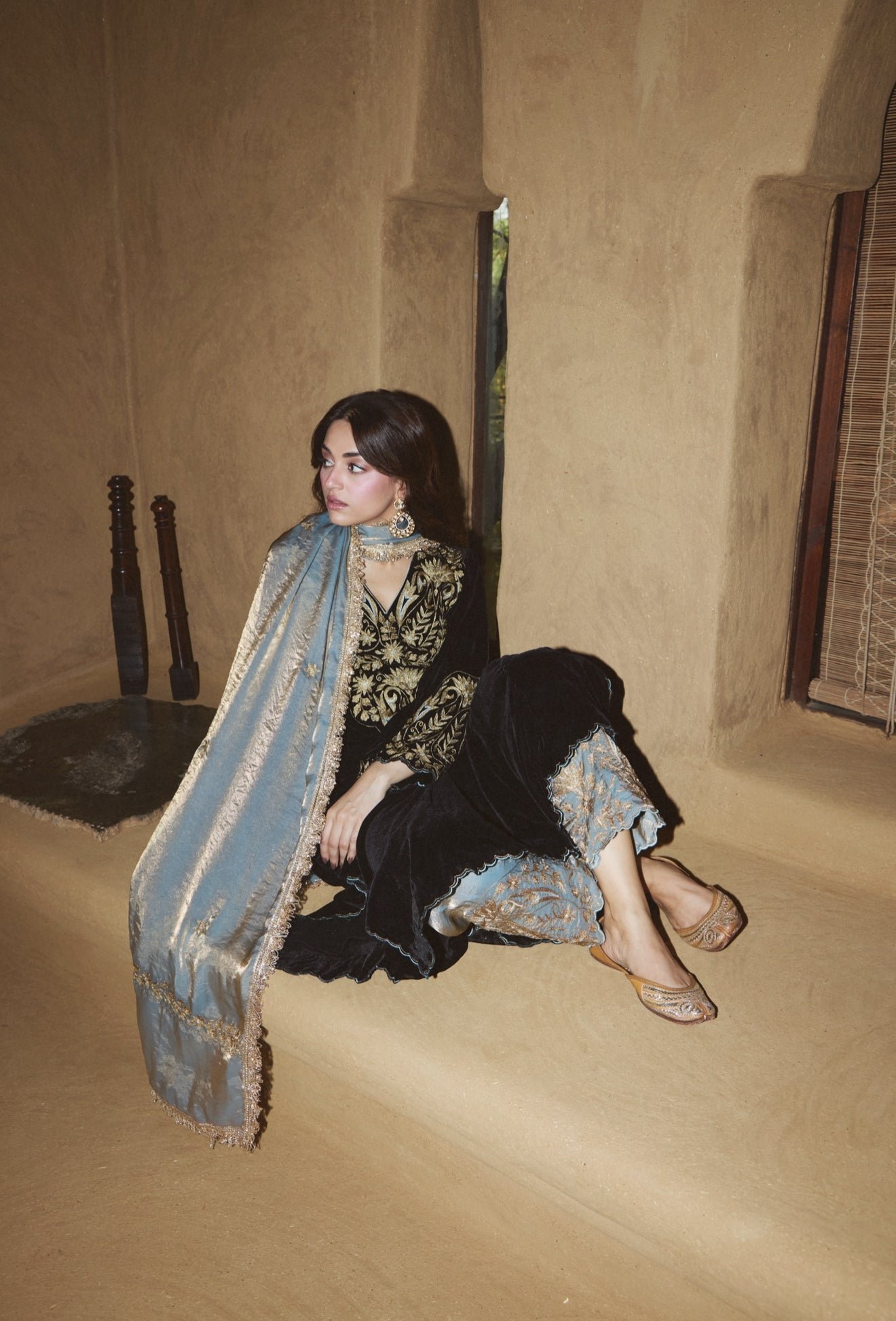 Embrace winter opulence with this black velvet pheran, featuring ornate gold tilla embroidery that reflects heritage craftsmanship. The plush velvet offers a rich texture, beautifully contrasted by ice blue tissue pants and a matching embroidered dupatta. This ensemble blends a relaxed Kashmiri silhouette with modern, high-fashion elegance for any evening soirée.
