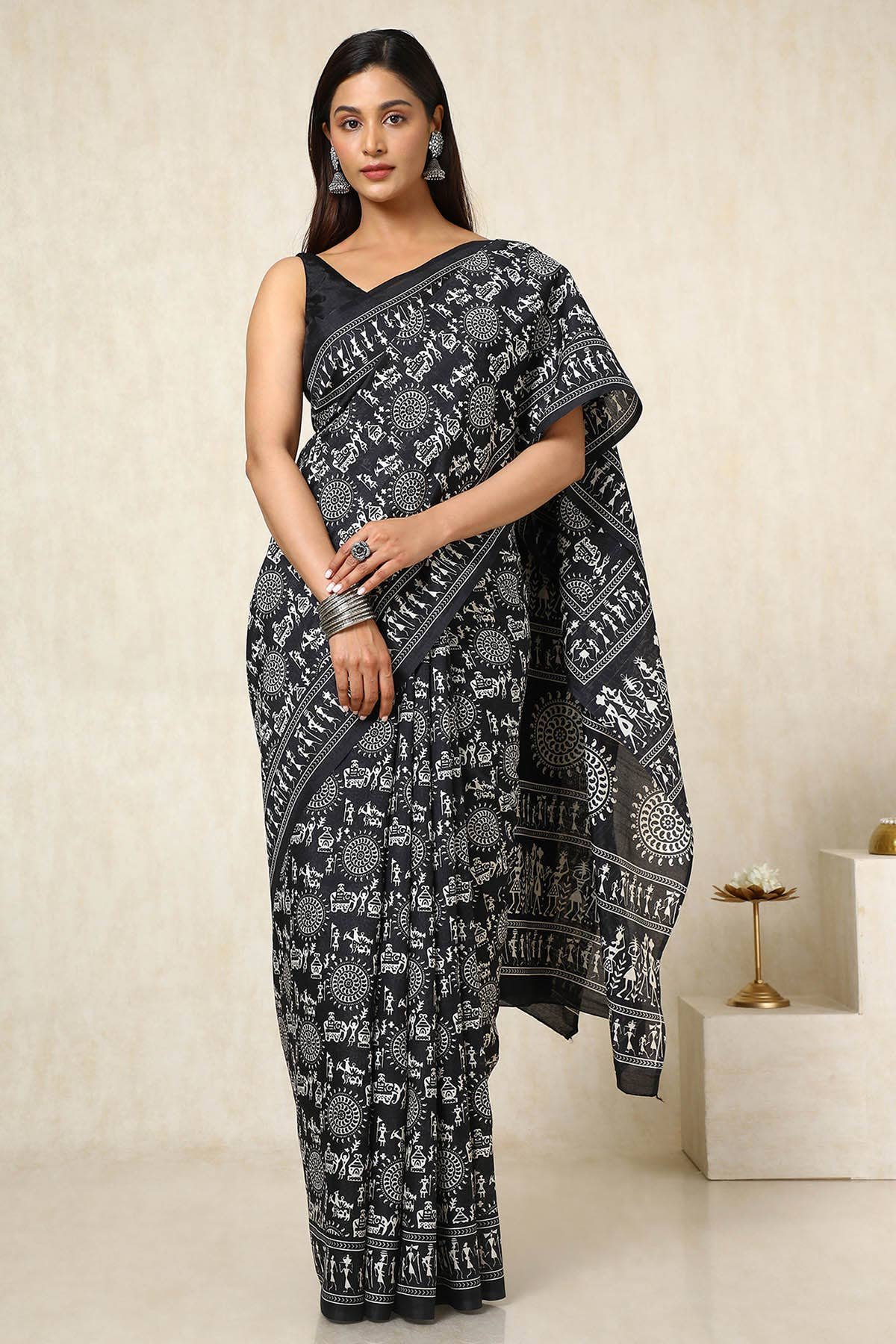 / Black Warli Print Art Silk Saree