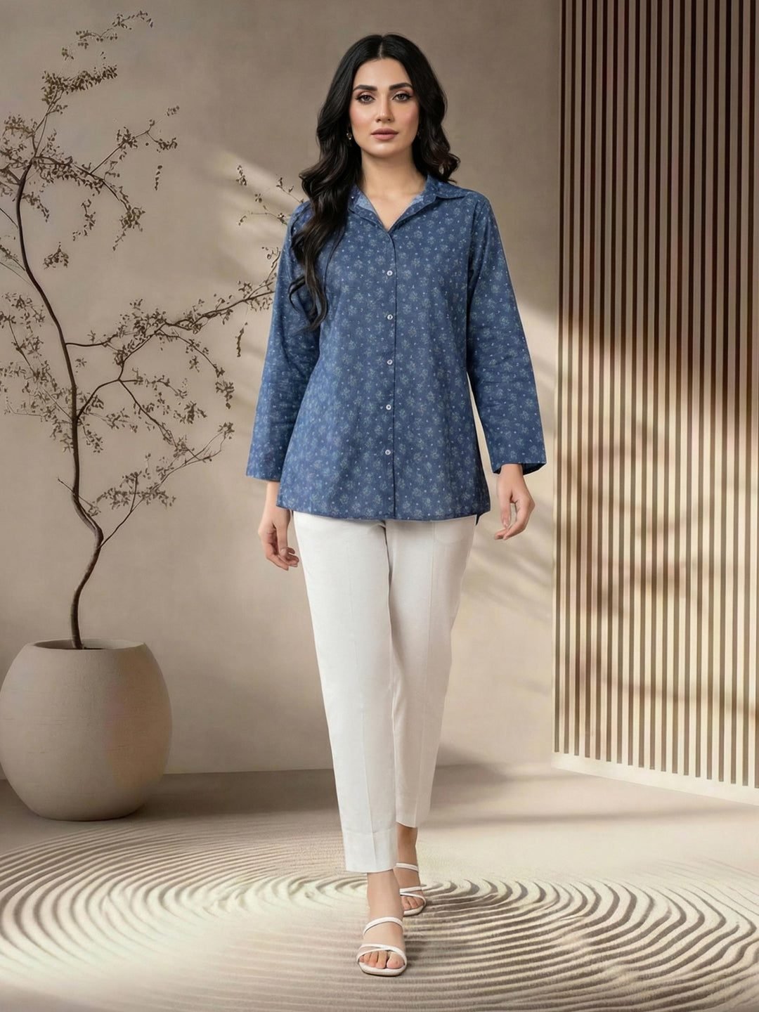 Elevate your festive repertoire with our Indigo Floral Cambric Kurti, a testament to the understated luxury of refined South Asian craftsmanship. The garment is fashioned from high-density Cambric cotton, a fabric with a storied history dating back to the 16th century, prized for its smooth, lustrous finish and superior durability. This kurti features a sophisticated micro-floral print, a modern interpretation of the ‘Buti’ motifs that once adorned the royal courts of Rajasthan. The print is rendered in a monochromatic palette of soft blues, creating a visual texture that is both complex and calming. The silhouette is a masterclass in fusion tailoring, featuring a crisp shirt collar and a button-down front that lends a structured, professional edge to traditional attire. The sleeves are cut to a precise straight fit, while the hemline is expertly curved to provide a flattering drape over slim-fit trousers. This piece is designed for the discerning woman who appreciates the nuances of ‘minimalist luxury.’ For high-profile festivals or wedding-related dinners, elevate this kurti by pairing it with a heavy Banarasi silk stole or a vibrant Phulkari dupatta for a pop of color. Accessorize with Polki diamond studs and a sleek, gold-toned clutch to bridge the gap between heritage and modernity. The artisanal quality of the print, combined with the precision of the Western-influenced silhouette, makes this kurti a versatile powerhouse. Whether you are attending a festive soirée or a celebratory family dinner, this ensemble ensures a look of polished elegance that honors the past while embracing the future of South Asian fashion.