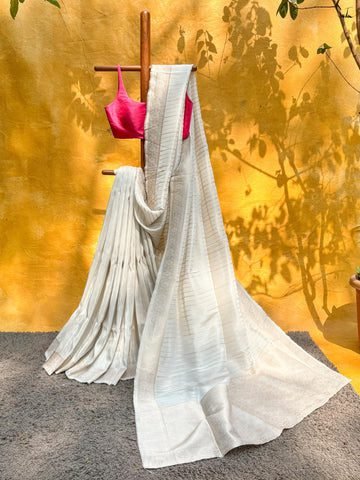 The Chandni Gold Saree is a breathtaking homage to the celestial beauty of moonlight, meticulously crafted for the woman who embodies grace and regal sophistication. Rooted in the illustrious weaving heritage of Central India, this saree draws inspiration from the translucent textures of Chanderi and the opulent metallic traditions of Banaras. The fabric is a luxurious blend of premium tissue silk and fine cotton, offering a gossamer-like quality that is both lightweight and structurally sound. Every inch of this six-yard masterpiece is a testament to artisanal hand-work, featuring delicate ‘Zari’ work where real metallic threads are interwoven with silk to create a shimmering, ethereal glow. The body of the saree is characterized by subtle horizontal stripes of gold, while the borders are finished with a dense, lustrous weave that frames the silhouette with architectural precision. For a grand wedding or a festive gala, we recommend styling this saree with the provided fuchsia pink raw silk blouse, creating a vibrant contrast that celebrates the bold spirit of South Asian festivities. Complete the ensemble with traditional temple jewelry, a heavy choker, and a sleek low bun adorned with fresh jasmine. The silhouette of the Chandni Gold is designed to drape fluidly; the tissue silk ensures the pleats remain crisp and defined at the waist, while the pallu cascades over the shoulder with a liquid-gold effect, making it an heirloom-worthy addition to any luxury wardrobe. This saree is not merely an outfit, but a piece of living history that carries the soul of the loom into the modern era.