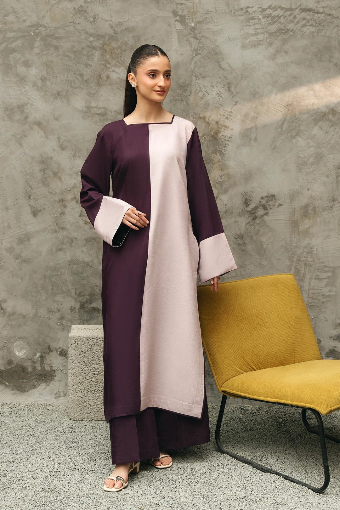 The ‘Chroma’ ensemble is a breathtaking study in duality and geometric precision, representing the bold evolution of South Asian couture. Drawing inspiration from the ‘Do-Rung’ (two-toned) dyeing traditions of the Rajasthani and Punjabi heritage, this three-piece set features a striking vertical color-block design that seamlessly merges a deep, royal plum with a soft, ethereal lilac. The fabric is a luxurious, medium-weight crepe-silk blend that offers a flawless fall, ensuring the silhouette remains structured yet breathable throughout long festive hours. The square neckline is a deliberate nod to the architectural motifs of the subcontinent’s heritage monuments, providing a clean, modern frame for the face and neck that is rarely seen in traditional wear. Each panel is joined with precision ‘invisible’ stitching, a testament to the skill of master tailors who specialize in high-fashion construction. The sleeves mirror the body’s duality, with oversized contrasting cuffs that add a layer of visual interest and a sense of ‘Nawabi’ grandeur to every gesture. This ensemble reimagines the classic ‘Kameez’ as a piece of wearable art, with a silhouette that flows into expansive, wide-leg trousers that provide a dramatic ‘Gher’ (flare) as you move. For a festive Sangeet or a glamorous Eid celebration, style ‘Chroma’ with a statement silver ‘Guluband’ choker and sleek, pulled-back hair to emphasize the sharp lines of the design. The interplay of dark and light shades makes it a versatile choice for both daytime festivities and evening galas, offering a contemporary twist on the vibrant spirit of South Asian fashion.