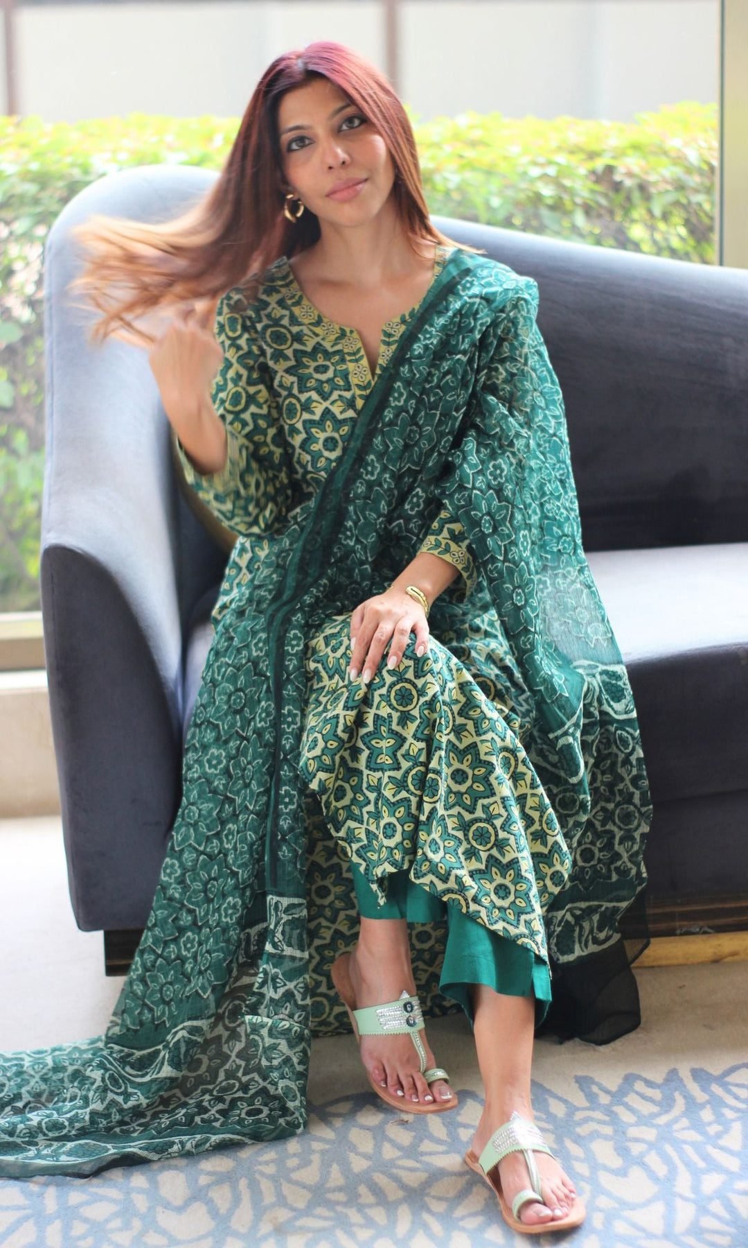 Step into a world of timeless elegance with our Cotton Green Ajrakh Vanaspati Suit Set, a masterpiece that pays homage to the ancient craft of Ajrakh printing. Originating over 3,000 years ago in the Indus Valley civilization, Ajrakh is more than just a technique; it is a spiritual connection to nature. This ensemble features the ‘Vanaspati’ palette, utilizing 100% natural vegetable dyes derived from indigo, madder, and pomegranate skins to achieve its deep, earthy forest green tones. The kurta is meticulously hand-block printed using traditional wooden blocks, showcasing intricate geometric patterns and floral trellises that symbolize the cosmos. Crafted from the finest long-staple cotton, the fabric offers a breathable, luxurious hand-feel that softens with every wear. The silhouette is a sophisticated straight-cut kurta with a flattering V-neckline and three-quarter sleeves, paired with tailored trousers that provide a modern, streamlined look. The piece de resistance is the Kota Doria dupatta, hailing from the royal looms of Rajasthan. Known for its ‘khat’ or square-check weave, the dupatta is weightless and translucent, featuring a delicate floral print that complements the boldness of the Ajrakh. For a grand festive occasion like a Mehendi or a daytime wedding ceremony, style this set with oxidized silver jhumkas, a stack of glass bangles, and hand-crafted mojris. The interplay of the structured cotton and the ethereal Kota Doria creates a silhouette that is both grounded and regal, making it a perfect choice for the modern woman who cherishes her heritage. This suit set is not just an outfit; it is a wearable piece of history designed for the connoisseur of slow fashion.