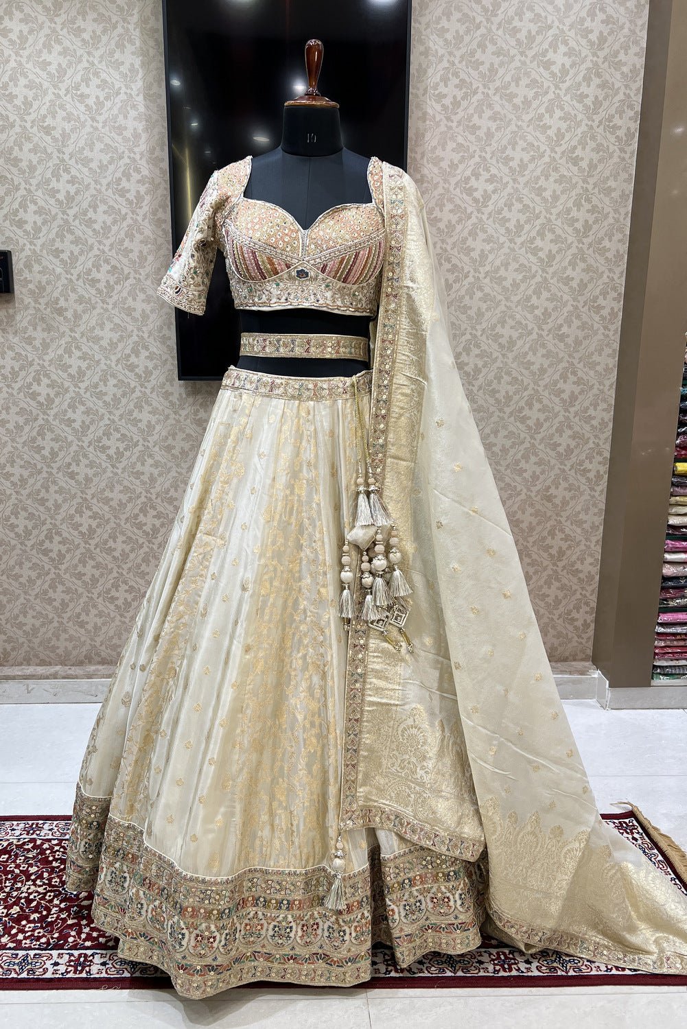 Cream Pearls, Stone, Zari, Sequins, Banaras And Multicolor Thread Work Crop Top Lehenga