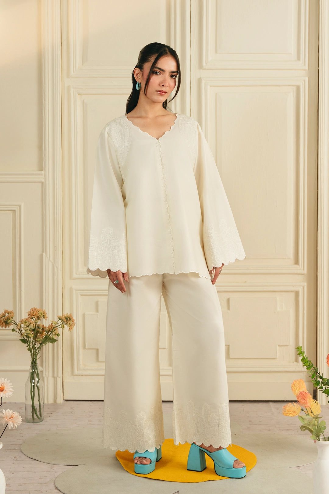 Evoking the ethereal glow of a lunar landscape, the ‘Crescent’ ensemble is a masterclass in monochromatic luxury and minimalist South Asian opulence. This three-piece silhouette is crafted from the finest ivory raw silk, a fabric celebrated for its subtle sheen and structured drape, which has been a staple of royal wardrobes for centuries. The centerpiece of this outfit is the meticulously executed tonal embroidery that pays homage to the legendary craft of Chikankari, an artisanal tradition originating from the Mughal courts of Lucknow. The intricate white-on-white threadwork is delicately placed along the neckline and the expansive bell sleeves, creating a texture that is both tactile and visually mesmerizing. Each stitch reflects a heritage of patience and precision, where the artisan’s needle mimics the delicate veins of a leaf and the soft curves of a crescent moon. The tunic features a modern, boxy silhouette with an elegant V-neckline, finished with hand-carved scalloped edges that run along the hem and sleeve openings, adding a layer of architectural sophistication. Paired with wide-leg palazzos that mirror the scalloped detailing at the hem, the ensemble offers a fluid, statuesque movement. For a grand occasion like a Nikkah or an intimate festive dinner, style this look with statement turquoise or emerald jewelry to provide a regal pop of color against the pristine ivory. Finish the look with sleek, pulled-back hair and metallic silver heels to emphasize the garment’s clean lines and heritage-inspired craftsmanship. The ‘Crescent’ is more than just an outfit; it is a timeless heirloom that celebrates the purity of craft and the enduring grace of the modern woman.