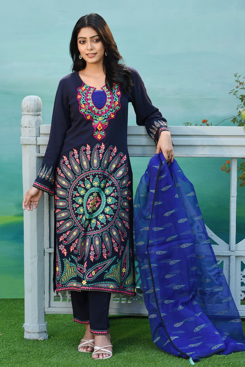 Discover the perfect harmony of comfort and artisanal craftsmanship with our Dark Navy Blue Linen Printed & Hand Embroidered Salwar Kameez Set. At the heart of this ensemble lies the celebrated history of linen, a textile prized for its durability and exceptional breathability, making it a staple for the refined South Asian wardrobe. This set reimagines the fabric with a deep, midnight navy hue that serves as a dramatic backdrop for vibrant hand-embroidery. The focal point is a magnificent, oversized mandala-inspired motif on the front, meticulously rendered in a palette of shocking pink, lime green, and sun-drenched yellow. This artisanal hand-work draws from the rich tradition of folk motifs, where every stitch tells a story of cultural identity and precision. The embroidery extends to a beautifully detailed, scalloped neckline and intricate sleeve borders, ensuring a cohesive and high-fashion aesthetic. The silhouette follows a structured long-line kameez with side vents, paired with sleek, tailored trousers that provide a modern, streamlined look. The ensemble is completed by a diaphanous, cobalt blue dupatta, adorned with delicate paisley prints that add a layer of ethereal grace when draped. For an upscale evening soiree or a festive gathering, we recommend styling this piece with oxidized silver statement jewelry and a sleek low bun. The contrast between the matte, textured linen and the vivid, multi-colored embroidery creates a striking visual impact that commands attention. This Salwar Kameez set is not merely an outfit; it is a wearable piece of art that honors the meticulous hands of the craftsmen who keep these ancient traditions alive.