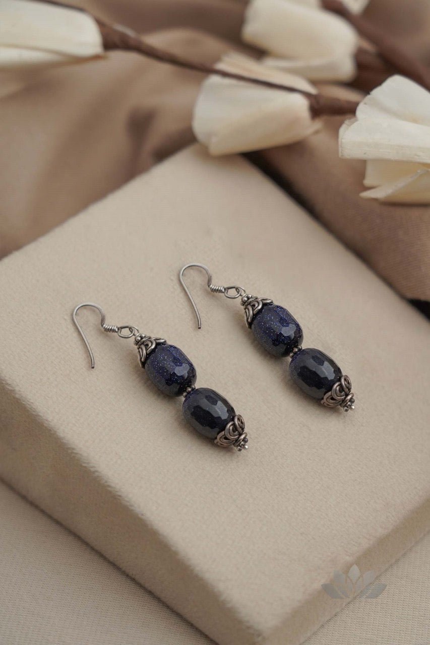 The Nimir earrings celebrate artisanal craftsmanship with deep navy sandstone beads that shimmer like a star-filled midnight sky. Encased in finely detailed silver caps, these elegant drops offer a refined silhouette. Their versatile design seamlessly transitions from traditional ceremonies to contemporary gatherings, embodying understated luxury and celestial beauty.