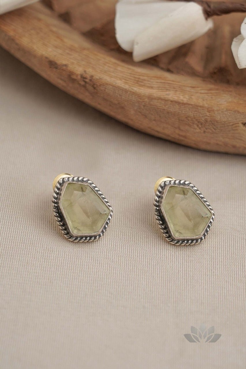 Exuding understated elegance, the Rachel earrings feature translucent pale-green stones encased in meticulously handcrafted sterling silver. The artisanal rope-textured border adds vintage charm to the modern geometric silhouette. Perfect for elevating a silk Chanderi saree or a contemporary fusion ensemble, these studs reflect timeless South Asian craftsmanship in every detail.