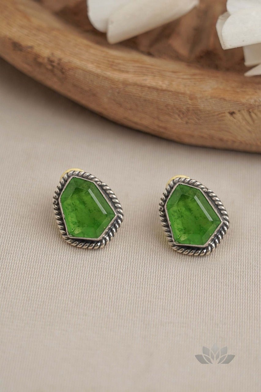 Radiating natural brilliance, the Rebecca earrings feature striking emerald-green faceted stones. Each gem is cradled in a handcrafted, rope-textured silver border, highlighting the raw beauty of the geometric cut. These artisanal studs are a testament to fine silver craftsmanship, adding a regal touch of color to any festive or formal attire.