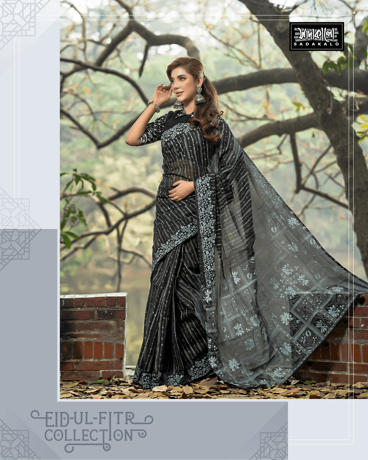 Step into a realm of timeless elegance with our Eid Festival Screen Printed Half Silk Sharee, a masterpiece that pays homage to the rich textile heritage of South Asian craftsmanship. This sharee is meticulously crafted from ‘Half Silk’—a quintessential blend that marries the opulent sheen of pure silk with the airy, breathable comfort of fine cotton. This unique weave originated from the desire to create a fabric that retains a royal luster while remaining practical for the tropical climate of the subcontinent. The body of the sharee features a deep, obsidian black canvas adorned with delicate vertical stripes, creating an elongating silhouette that exudes sophistication. The true artistry lies in the elaborate screen printing, a technique where artisans manually layer pigments through fine mesh to create intricate motifs. Here, icy-blue and silver-toned floral vines creep along the borders and dance across the ‘anchal’ (pallu), reminiscent of traditional Jamdani patterns but reimagined with a modern, crisp finish. The drape of this half silk fabric is unparalleled; it holds crisp, sharp pleats at the waist while the pallu flows effortlessly over the shoulder, showcasing the dense, block-printed geometric and floral panels. For a grand Eid celebration or a festive wedding reception, style this ensemble with heavy oxidized silver jhumkas and a statement ‘nath’ to lean into the heritage aesthetic. A sleek low bun adorned with jasmine flowers and a bold kohl-rimmed eye will complete this look of regal poise, making you the centerpiece of every festive gathering.