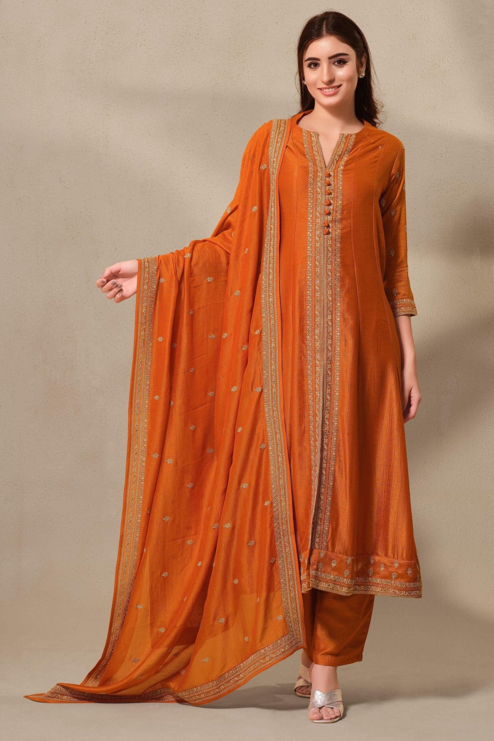 / Elegant Rust Orange Silk Anarkali Suit Set With Satin-Silk Dupatta