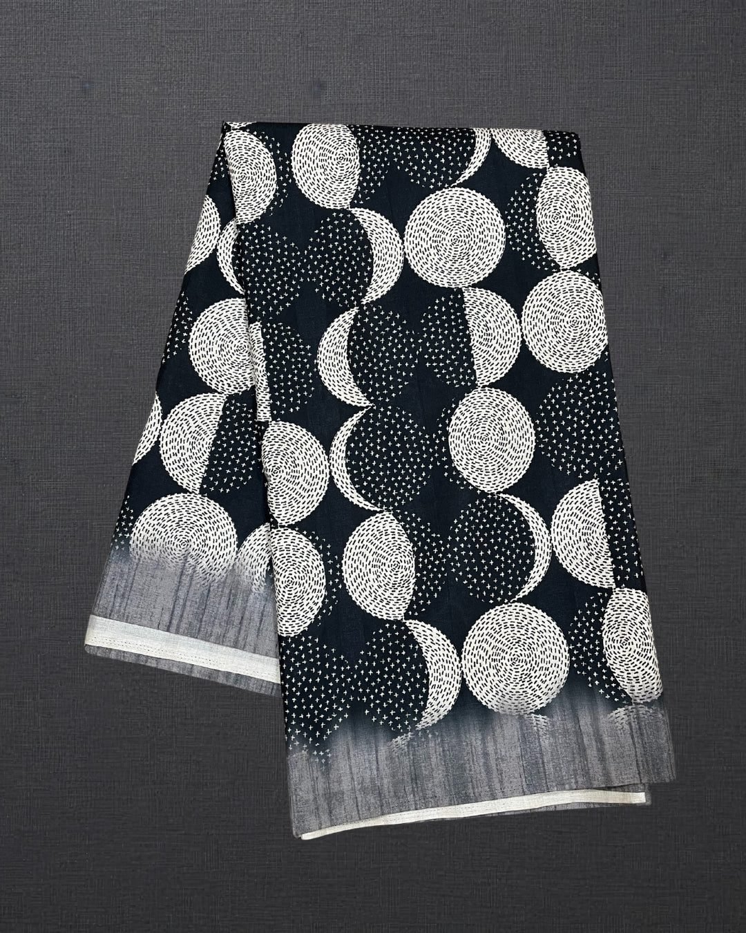 Embrace the raw, untamed beauty of the East with our Elegant Tussar Silk Saree, a testament to the centuries-old heritage of ‘Wild Silk’ or Kosa silk. Sourced from the silkworms of the forest, Tussar is celebrated for its unique, porous texture and a natural dull-gold luster that exudes an understated luxury. This particular masterpiece breaks away from traditional earthy tones, presenting a sophisticated charcoal-black canvas that serves as a dramatic backdrop for artisanal thread embroidery. The embroidery itself is a modern homage to the Kantha craft of Bengal; each circular motif is composed of thousands of delicate white running stitches, creating a ‘Moon-phase’ effect that dances across the fabric. The tactile contrast between the crisp, slightly stiff Tussar and the soft, raised texture of the thread work makes this saree a sensory delight. The silhouette is designed for the modern woman who values structure; the saree drapes with a regal stiffness that holds its shape, while the gradient grey border adds a touch of contemporary ombre flair. The placement of the embroidery is densest at the pallu, ensuring that your movements are punctuated by the rhythmic patterns of the thread. For a grand festive occasion or a winter wedding reception, style this saree with a structured silk corset blouse or a high-collared velvet piece. Accessorize with oversized oxidized silver jhumkas and a stack of black glass bangles to lean into the monochromatic aesthetic. Whether you are attending a high-profile art gallery opening or a traditional ceremony, this saree promises a presence that is both intellectual and immensely stylish.