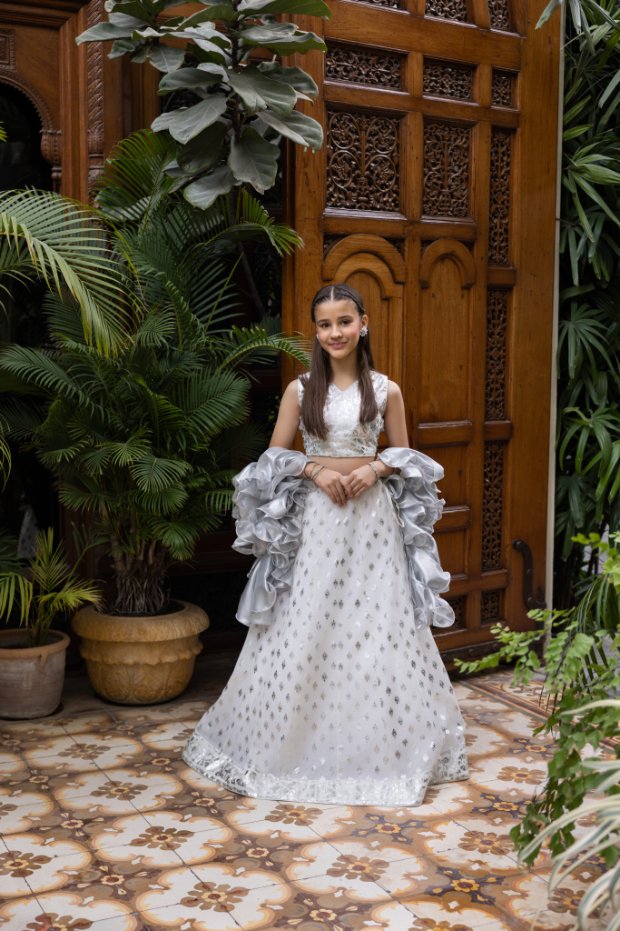 Step into a realm of celestial grace with the Elham Lehenga, a masterpiece of contemporary South Asian couture designed for the young debutante. This ensemble is a poetic tribute to the ‘Mukaish’ work of Lucknow, a craft that dates back to the 3rd century B.C. and reached its zenith under the patronage of the Nawabs of Awadh. The Elham features an ethereal ivory canvas adorned with meticulously placed silver diamond-shaped motifs that mimic the shimmering ‘fardi’ dots of traditional metal-wire embroidery. Each motif is a testament to artisanal patience, catching the light with every movement to create a moonlit glow. The fabric is a high-grade silk-organza blend, providing a structured yet lightweight drape that allows for effortless movement during grand celebrations. The silhouette is defined by a classic A-line flare in the lehenga skirt, paired with a sleeveless, impeccably tailored choli that emphasizes modern minimalism. The piece de resistance is the avant-garde dupatta, reimagined with dramatic, voluminous ruffles that cascade down the arms, blending the heritage of the Indian subcontinent with the flair of Victorian-era frills. For a grand wedding or a festive Eid gathering, style the Elham with delicate silver ‘haath-phool’ and a dusting of shimmer on the eyes. This ensemble is not merely a garment; it is a bridge between the regal history of the Mughal courts and the spirited energy of the modern generation, ensuring that the wearer remains the cynosure of all eyes in a sea of tradition.