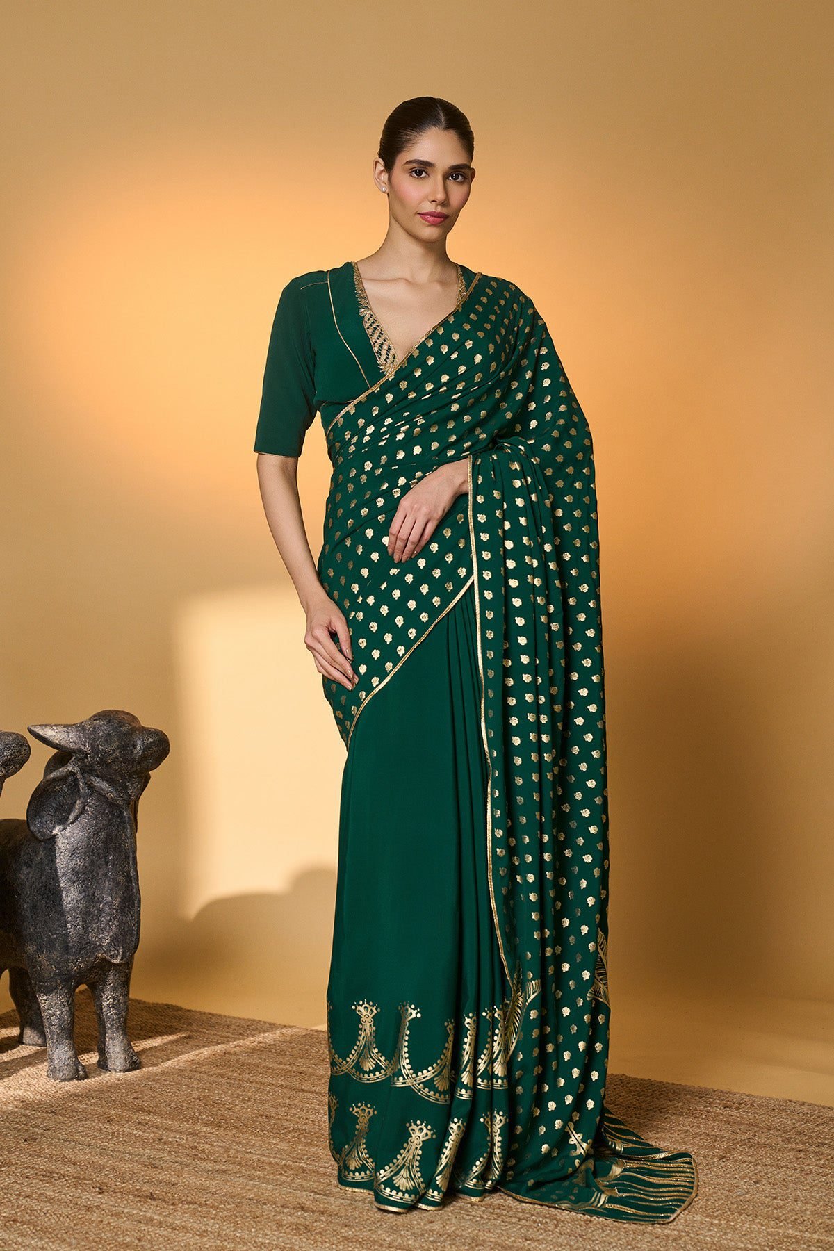 The Emerald Green Palm Tree Saree is a verdant masterpiece that seamlessly bridges the gap between traditional South Asian opulence and contemporary tropical aesthetics. Drawing inspiration from the lush, sun-drenched landscapes of the Malabar Coast, the palm tree motif serves as a symbol of peace and prosperity, reimagined here in a regal gold tilla-style print. The heritage of this piece is rooted in the ‘Butti’ tradition, where small, repetitive motifs are scattered across the field of the fabric—a technique perfected over centuries in the weaving hubs of Varanasi and Bengal. This saree is meticulously crafted from premium fluid crepe, a fabric chosen for its exceptional weight and ‘dhall’ (drape), ensuring it clings to the silhouette in all the right places while remaining breathable for long festivities. The artisanal hand-work is evident in the intricate gold-foiled borders and the architectural ‘Mehrab’ (arch) patterns decorating the hemline, which echo the grand doorways of Mughal palaces. The saree features a classic six-yard drape, with the pallu cascading over the shoulder to reveal a dense arrangement of palm motifs that catch the light with every movement. For a grand wedding or a festive Diwali celebration, style this ensemble with heirloom Polki or Emerald-encrusted jewelry to complement the deep forest tones. A sleek, center-parted bun and a bindi will complete the look, making it ideal for a Sangeet or a high-profile reception. The accompanying blouse, with its plunging V-neckline and structured elbow-length sleeves, adds a modern edge to the traditional silhouette, ensuring the wearer stands out as a beacon of sophisticated grace.