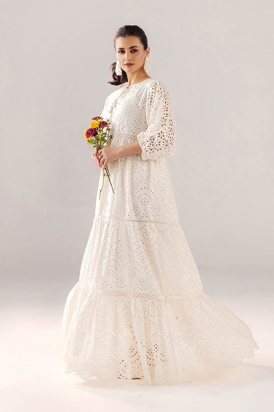 The silhouette is a modern, floor-length interpretation of the ‘Peshwas,’ featuring a high-waisted bodice that flows into a dramatic, multi-tiered skirt. This layering adds an incredible sense of movement, ensuring a regal sweep and a beautiful ‘ghera’ (flare) with every step. The sleeves are a highlight of the design—voluminous bishop sleeves that gather elegantly at the wrist, adorned with the same intricate eyelet embroidery to create a cohesive, high-fashion look. For a grand occasion like a summer garden wedding or a festive Nikkah ceremony, this outfit demands accessories that complement its purity. Opt for oversized pearl-encrusted ‘Chandbalis’ and a stack of delicate silver bangles. A soft, romantic updo and a pair of hand-crafted ‘Khussas’ will complete the look, making the wearer appear as a vision of classic grace. The F-190 is a tribute to the enduring allure of white-on-white craftsmanship, offering a sophisticated blend of vintage charm and contemporary bridal flair.