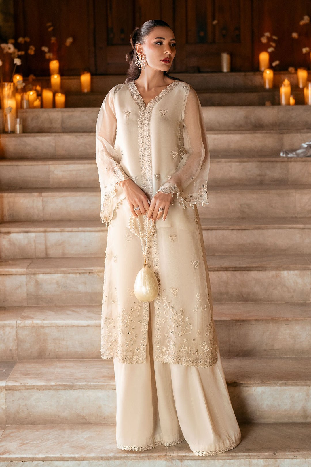 The Fw25dl-0339 ‘Off White’ ensemble is an ethereal manifestation of timeless grace, designed for the modern connoisseur of South Asian couture. This two-piece shirt and trouser set is a poetic tribute to the ‘Noor’ or light of ivory, a palette that has defined aristocratic elegance for centuries. The shirt is constructed from premium, translucent organza, offering a delicate play of light and shadow that feels both vintage and avant-garde. It features a sophisticated front-open silhouette that creates a statuesque verticality, lengthening the form with effortless ease. The V-neckline is adorned with intricate Resham embroidery and delicate beadwork, leading the eye down a central panel of artisanal motifs that recall the heritage of Chikankari but with a contemporary, high-fashion twist. The sleeves are a highlight of the design—billowing and fluid, they terminate in wide, embroidered cuffs finished with artisanal pearl drops that tinkle softly with every gesture. The trousers are cut in a wide-leg, floor-grazing silhouette, providing a voluminous contrast to the structured shirt and ensuring a walk that is nothing short of majestic. The hem of the shirt is finished with a deep, ornate border of floral embroidery, balanced by the minimalist elegance of the monochromatic ivory fabric. For a Nikah, an engagement, or a sophisticated evening reception, style this ensemble with statement Polki earrings and a pearl-encrusted potli bag. A soft, dewy makeup look and a sleek high ponytail will emphasize the garment’s clean lines and intricate details. This ensemble captures the essence of understated luxury, blending the artisanal soul of the past with the refined aesthetics of the present.
