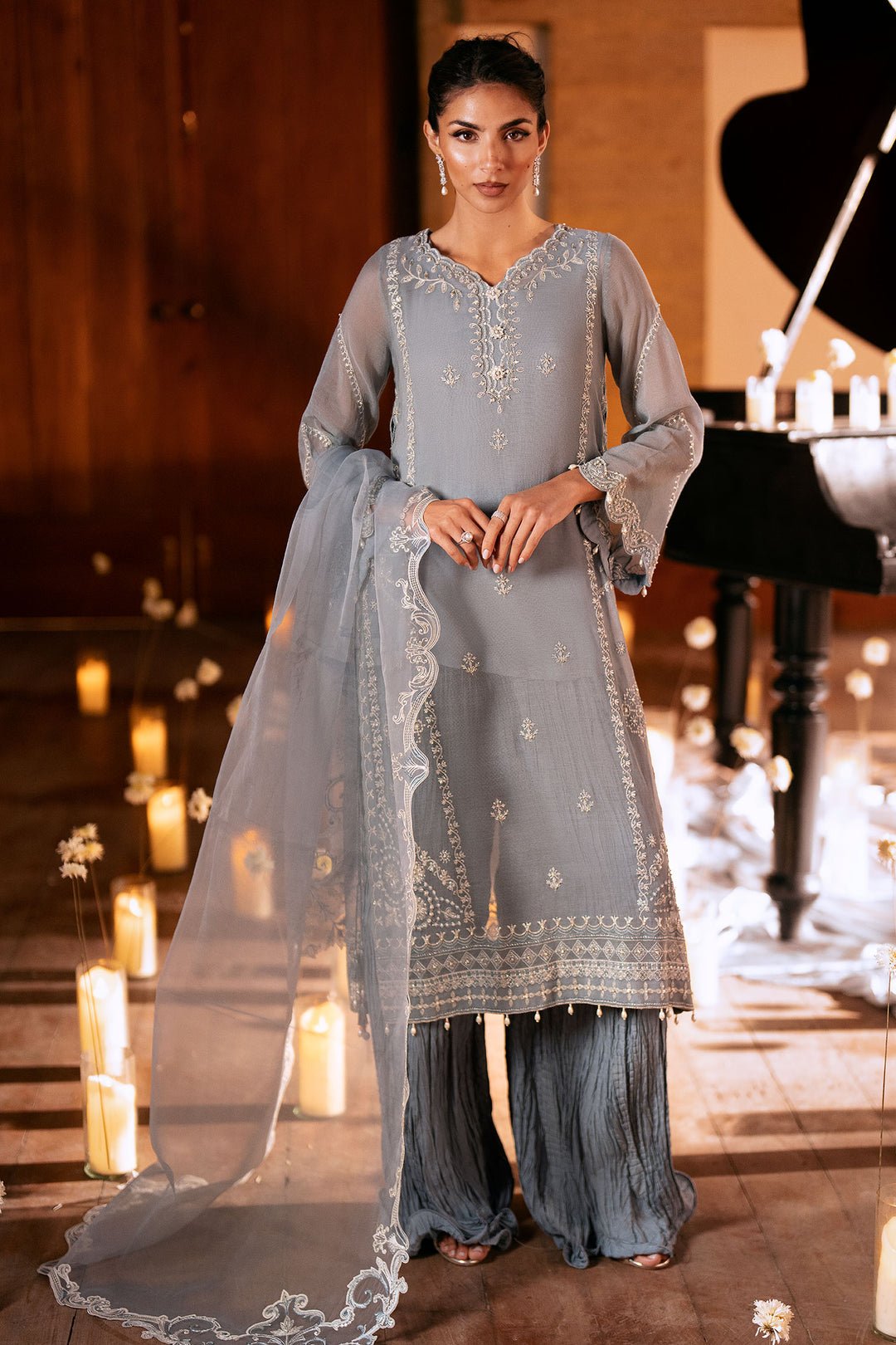 Step into a realm of ethereal grace with the Fw25dl-0343, a three-piece masterpiece rendered in a sophisticated shade of slate grey that evokes the misty mornings of the Himalayan foothills. This ensemble is a poetic tribute to the timeless heritage of South Asian craftsmanship, drawing profound inspiration from the delicate ‘Resham’ embroidery techniques that flourished under the patronage of the Nawabs of Lucknow. The shirt is meticulously crafted from premium, lightweight georgette chiffon, offering a fluid, liquid-like drape that moves with a whisper-soft elegance against the skin. The intricate white thread-work cascades down the neckline and bodice in a symphony of floral vines and geometric borders, showcasing the breathtaking precision of our master artisans who spend hundreds of hours on a single piece. The sleeves are designed in a dramatic bell silhouette, finished with ornate embroidery and delicate scalloped edges that add a touch of vintage romance. The hemline of the kameez is punctuated with dainty pearl droplets, providing a subtle rhythmic movement as you walk. To complement the structured elegance of the shirt, the ensemble features wide-leg trousers in a crushed silk texture, reminiscent of the traditional ‘Sharara’ but with a modern, streamlined twist that offers both volume and comfort. The look is completed with a sheer dupatta, boasting a broad, scalloped embroidered border that frames the face with luminosity. For a grand wedding ceremony or a formal festival, style this ensemble with heirloom silver jhumkas, a stack of glass bangles, and a sleek, low bun adorned with fresh jasmine. This piece isn’t just an outfit; it’s a canvas of heritage, designed for the woman who carries tradition with effortless modernity.