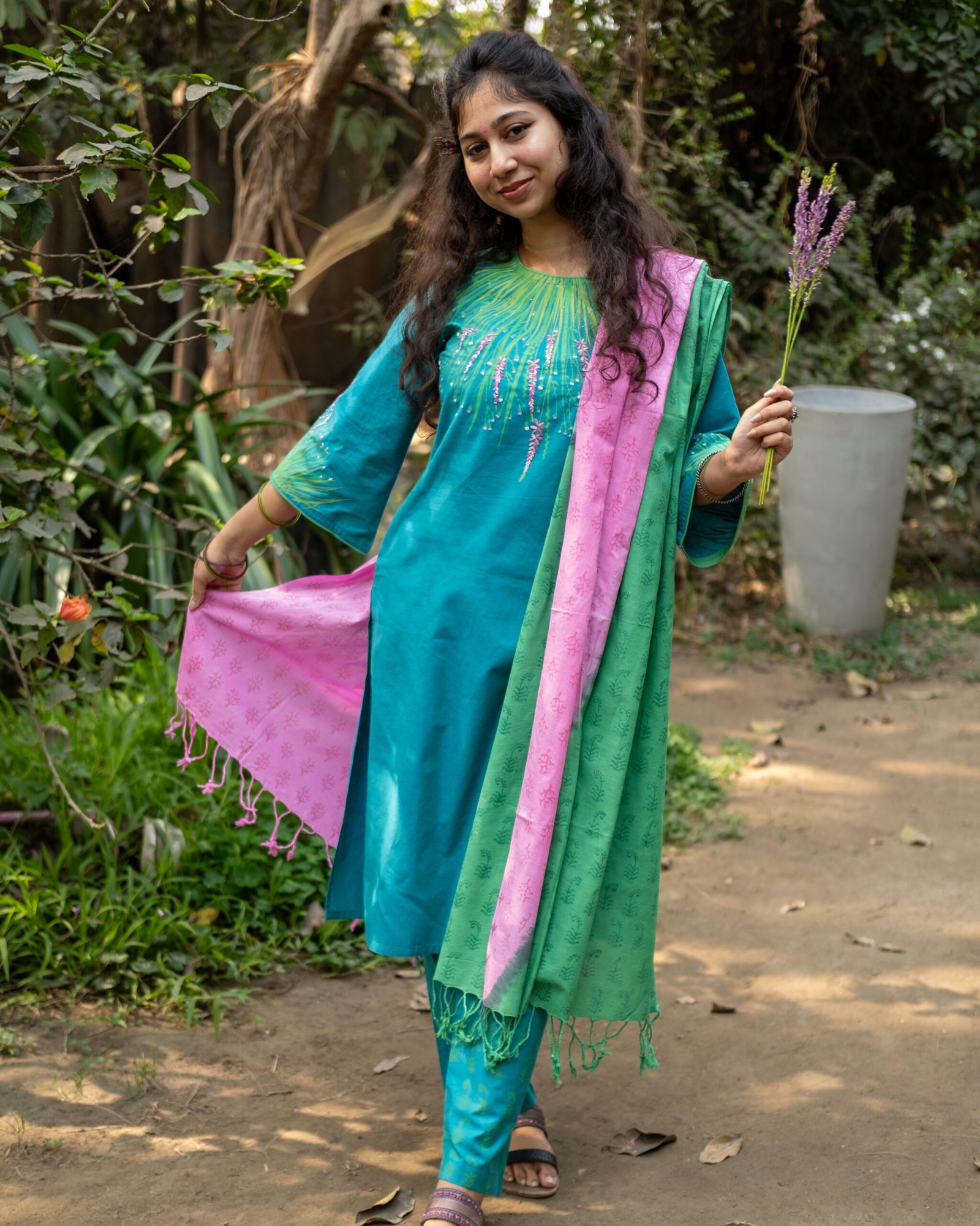 The ‘Ghash Phul’ Salwar Kameez is a poetic tribute to the delicate beauty of wild grass flowers that bloom across the meadows of the subcontinent, capturing a sense of ethereal grace. This ensemble is a celebration of the ‘Kashish’—the soulful art of hand-embroidery passed down through generations of master Karigars. Upon the vibrant teal bodice, one finds a mesmerizing display of needlework where silk threads are woven into intricate floral sprays that seem to sway in an invisible breeze. These motifs are subtly accented with tiny, shimmering sequins reminiscent of ‘Mukaish’ work, designed to catch the candlelight of an evening celebration. The fabric is a luxurious silk-cotton blend that possesses a soft, fluid drape, ensuring both comfort and a high-fashion aesthetic. The silhouette features a contemporary update with its gracefully flared sleeves, providing a dramatic touch that balances the traditional straight-cut kameez. The tapered trousers are adorned with subtle, repeating prints that echo the naturalistic theme of the collection. The dupatta is a true masterpiece of color-blocking and artisanal craft, merging a soft rose pink with a verdant leaf green. It is finished with delicate hand-tied tassels and intricate block-printed patterns that tie the entire look together. For grand occasions like an Eid gala or a festive garden wedding, this outfit demands to be paired with traditional gold Jhumkas and a stack of gold-toned bangles. A sleek, low bun adorned with fresh jasmine or a statement maang-tika will elevate the ensemble to new heights of sophistication. The ‘Ghash Phul’ is designed for the discerning woman who appreciates the intricate storytelling of South Asian craftsmanship and wishes to carry the serene beauty of the natural world into her most celebrated moments.
