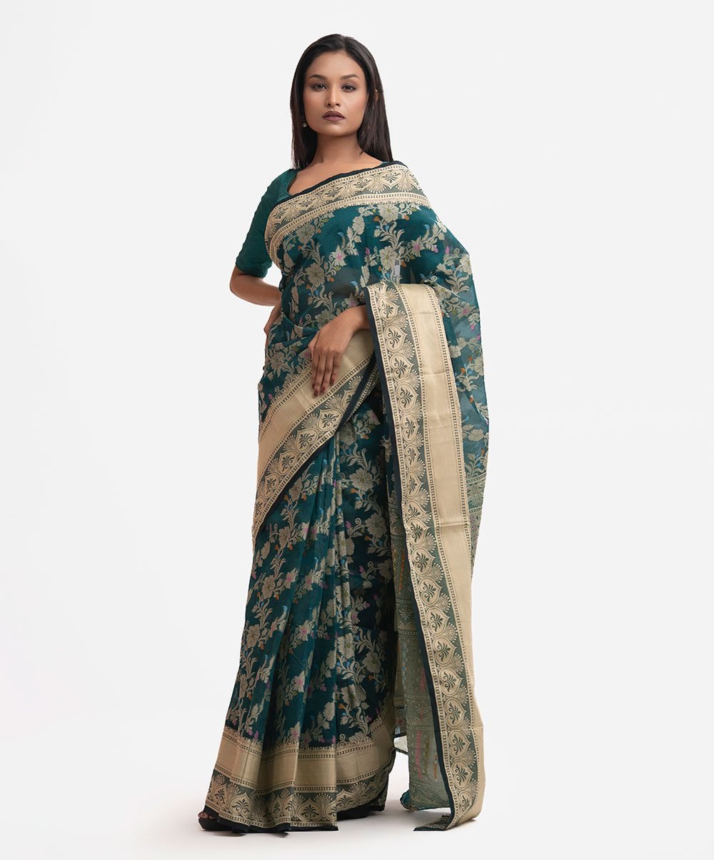 Immerse yourself in the verdant splendor of our Green Half-silk Saree, a garment that captures the essence of a moonlit forest. This deep emerald piece is a tribute to the legendary weaving centers of South Asia, where the art of blending silk and cotton has been passed down through generations of master weavers to create fabrics that are as durable as they are beautiful. The fabric possesses a unique tactile quality—the half-silk composition offers a matte-yet-luminous finish that is breathable for long festivities yet opulent enough for a grand reception. The saree is adorned with intricate floral ‘Jal’ or net-like patterns, reminiscent of the botanical illustrations found in classical miniatures. These motifs are executed with remarkable detail, featuring a palette of muted golds and soft pinks that pop against the deep teal-green ground. The border is the pièce de résistance: a wide, contrasting cream band featuring classical scrolls and floral vines, meticulously rendered to provide a structural frame to the drape. When draped, the saree falls with a sophisticated flare, the heavy border providing enough weight to maintain a flawless silhouette from the first pleat to the tip of the pallu. For an evening wedding or a festive gala, we recommend pairing this saree with a matching deep green blouse and statement polki diamonds or emerald-encrusted chokers. The placement of the embroidery is strategically designed to accentuate the wearer’s movements, with denser patterns concentrated on the pallu to create a dramatic effect as it trails. This is more than just a saree; it is a wearable piece of history, designed for the woman who commands attention through grace, heritage, and impeccable craft.