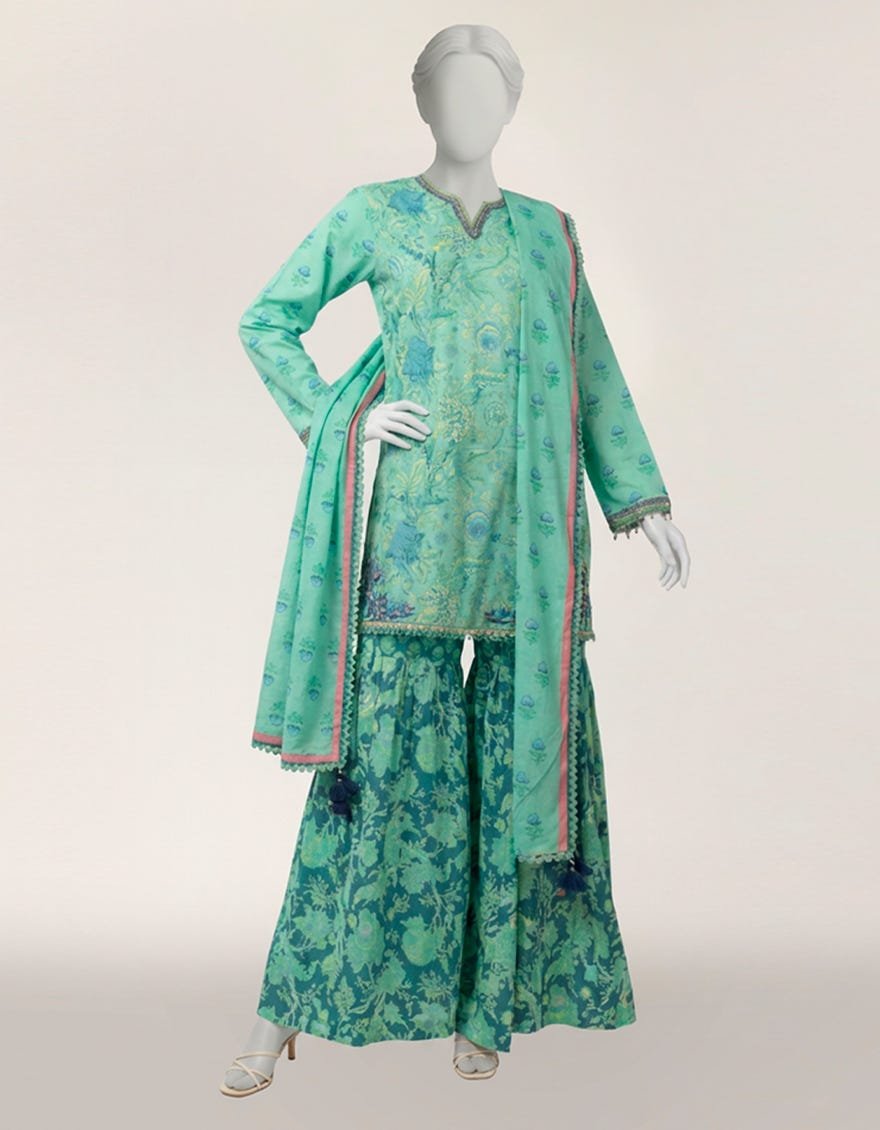Embrace the refreshing allure of our Green Lawn Embroidered 3pc, a masterpiece that pays homage to the rich textile heritage of the Indus Valley. The foundation of this ensemble is premium-grade lawn—a fabric celebrated for centuries for its ethereal lightness and breathability, making it the quintessential choice for the South Asian climate. This particular piece features a sophisticated seafoam and teal palette, adorned with intricate Resham embroidery along the split V-neckline, echoing the artisanal hand-work traditionally found in the craft clusters of Multan and Lahore. The silhouette is a stunning nod to the regal courts of Lucknow, featuring a short-length kurti paired with a dramatic Gharara. The Gharara is masterfully constructed with a voluminous flare that begins at the knee, allowing for a fluid, statuesque movement with every step. The print itself is a botanical symphony, blending traditional floral motifs with contemporary geometric accents across the sleeves and hemline. To complete the look, the ensemble includes a coordinating dupatta edged with a contrasting rose-pink piping and delicate lace trimmings, adding a pop of vibrant color to the cool green tones. For a grand festive occasion like a Mehendi or an Eid brunch, style this outfit with oxidized silver jhumkas, a stack of glass bangles, and embellished velvet khussas. The combination of the structured bodice and the expansive flare of the trousers creates a silhouette that is both traditional and trend-setting, ensuring you stand out with effortless grace and historical charm.