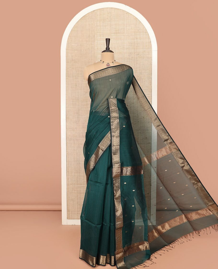 Immerse yourself in the regal legacy of Central India with this exquisite Emerald Green Maheshwari Cotton Saree. The origins of this weave trace back to the 18th century in the town of Maheshwar, where the legendary Queen Ahilyabai Holkar commissioned master weavers to create a textile that was as majestic as it was comfortable for the royal court. This saree is a profound testament to that history, hand-loomed from a fine blend of premium cotton and silk that offers a lightweight, airy texture with a subtle, luminous sheen characteristic of genuine Maheshwari weaves. The body of the saree is meticulously decorated with shimmering diamond-shaped zari buttas, reflecting the light with every movement. These motifs are inspired by the intricate architectural carvings found on the walls of the Maheshwar Fort, bringing a piece of heritage to your wardrobe.