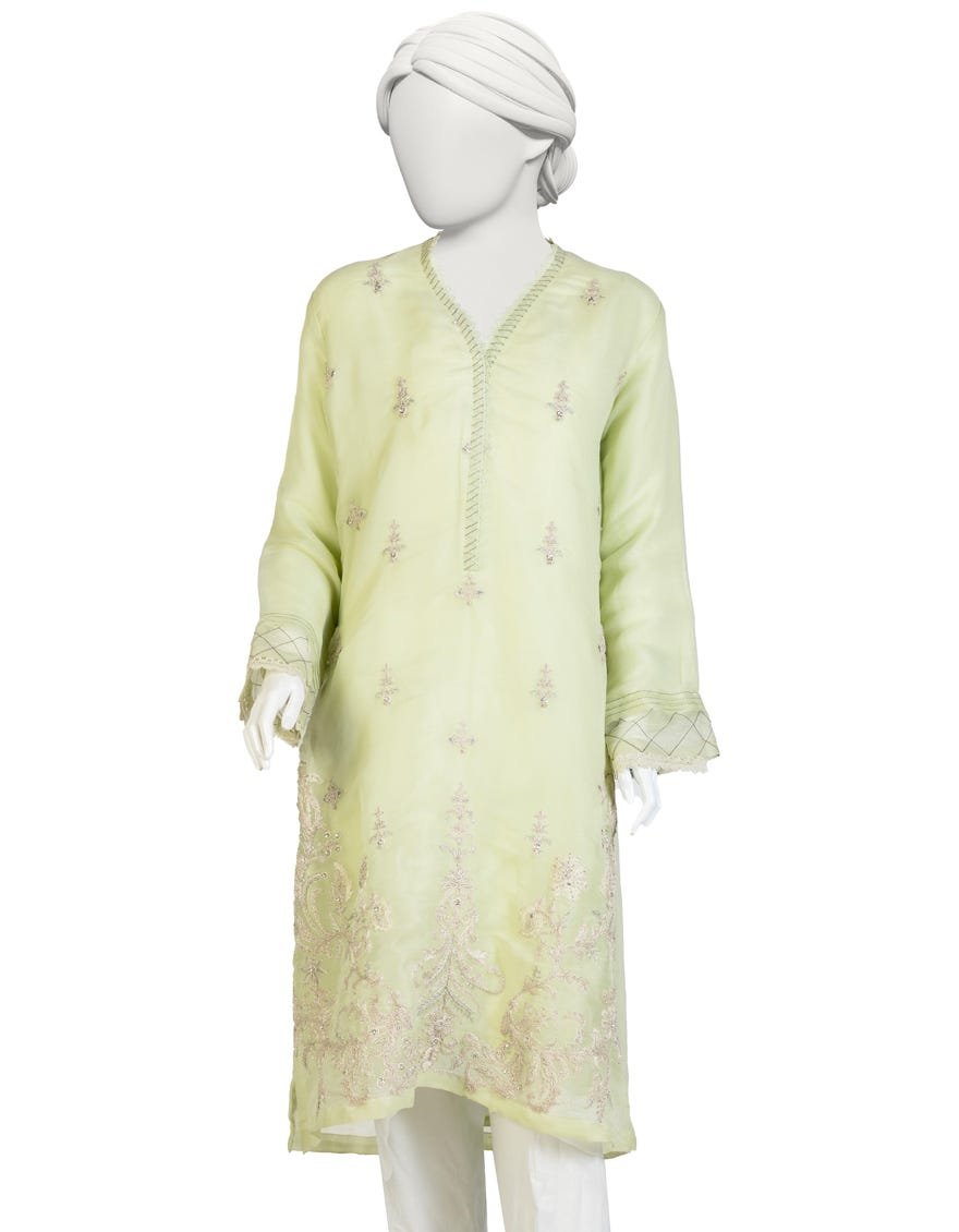 Drenched in the soft, ethereal glow of pistachio green, this Silk Kurta is a sublime celebration of the Moghul-inspired ‘Zardosi’ and ‘Resham’ hand-embroidery. The fabric is a luxurious, lightweight silk blend that offers a subtle translucency, mimicking the delicate texture of fine organza while maintaining the richness of traditional silk. The history of this craft dates back to the 16th century, where metal-bound threads were used to create opulent patterns for royalty; here, it is reimagined with a modern, delicate touch. The kurta features a sophisticated V-neckline adorned with intricate stitch-work that leads down to a body scattered with dainty floral ‘butis’. The true highlight of this silhouette is the heavily embellished hemline and sleeve cuffs, where silver tilla and silk threads intertwine to create a garden of crystalline flora. The scalloped edges and geometric lattice work on the sleeves provide a structural contrast to the fluid drape of the garment. For a high-profile wedding reception or an elegant Eid dinner, pair this piece with silk straight trousers and a diaphanous dupatta featuring mukaish specks. Accessorize with a polki diamond choker and a sleek potli bag to elevate the regal aesthetic. The silhouette is designed to skim the body gracefully, with high side slits that allow for effortless movement, ensuring you remain the epitome of poise and elegance throughout the festivities. This kurta is more than an outfit; it is a wearable piece of history, reflecting the meticulous patience of the artisans who brought it to life.