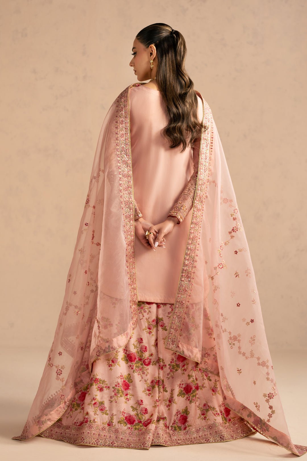Step into a living poem with ‘Hayaam,’ a three-piece ensemble that celebrates the enduring romance of the Mughal ‘Gul-e-Gulzar’ (garden of flowers). This outfit is a breathtaking fusion of traditional ‘Chintz’ floral aesthetics and the opulent ‘Gota Patti’ work that originated in the royal courts of Rajasthan. The base of the outfit is a soft, blush-pink hue that evokes the serenity of a dawning sun. The lower is a voluminous, multi-paneled ‘Kalidar’ lehenga or sharara, crafted from a luxurious silk-blend fabric that features a vibrant, digital print of blooming roses in shades of crimson and moss green. The flare is dramatic and ‘twirl-worthy,’ finished with a heavy, hand-embellished border featuring gold ‘Zardosi’ and ‘Tilla’ embroidery that catches the light with every step. The kameez provides a sophisticated contrast with its clean lines and subtle sheen, allowing the intricate details of the dupatta and lower to shine. Speaking of the dupatta, it is fashioned from ethereal sheer organza, sprinkled with delicate floral ‘Butis’ and framed by a four-sided metallic gold lace border. For a sun-drenched Mehendi ceremony or a grand Sangeet night, style ‘Hayaam’ with traditional gold ‘Jhumkas’ and a ‘Maang Tikka’ adorned with pink stones. A messy side-braid woven with fresh jasmine flowers and a pair of hand-painted gold ‘Khussas’ will complete this look of timeless femininity. ‘Hayaam’ is designed for the woman who carries the grace of the past into the celebrations of the present, making her the center of every floral fantasy.
