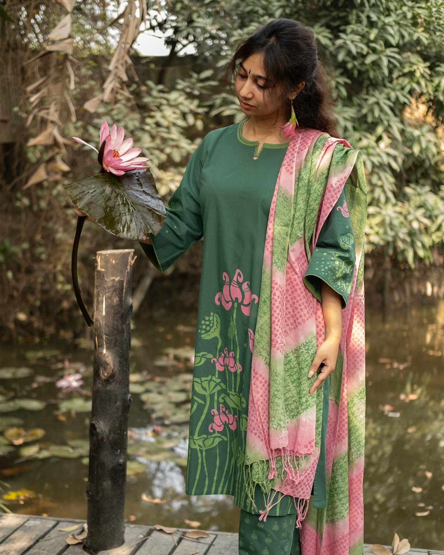 The Komolika-i Salwar Kameez is a breathtaking tribute to the verdant landscapes and botanical heritage of South Asia, meticulously crafted for the woman who embodies both strength and grace. The deep forest green base of the kurta serves as a canvas for the ancient art of hand-block printing, featuring a majestic rising lotus motif that climbs elegantly from the hemline. In South Asian culture, the lotus symbolizes purity and rebirth, and here it is rendered in a soft, contrasting petal pink that breathes life into the garment. The fabric is a premium blend of hand-spun cotton and silk, offering a subtle luster that catches the light during outdoor festive gatherings. Every stitch reflects a legacy of artisanal excellence, from the delicate piping along the neckline to the structured, straight-cut silhouette that provides a flattering, elongated frame. The ensemble is elevated by a dual-toned dupatta, featuring a mesmerizing tie-dye pattern in lime green and rose pink, reminiscent of the traditional ‘Leheriya’ techniques of Rajasthan. For a grand occasion such as a Mehendi or a daytime wedding ceremony, style this piece with oversized gold Jhumkas and traditional Mojaris in a neutral tan. The silhouette features a classic round neck with a subtle V-slit, mid-length sleeves that allow for intricate henna designs, and matching printed trousers that peek out with rhythmic floral patterns. This is more than just an outfit; it is a wearable piece of history that celebrates the intersection of nature and high fashion, ensuring you remain the cynosure of all eyes at any celebratory gala.