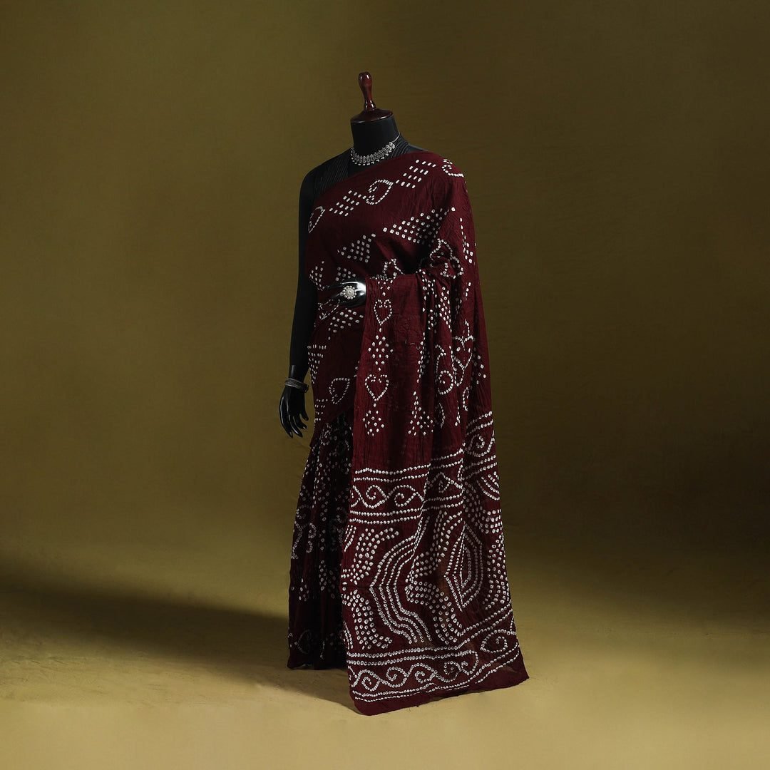 Step into the timeless allure of the Rann of Kutch with our Pure Cotton Bandhani Saree 07, a masterpiece that whispers tales of a thousand years. This exquisite drape is a celebration of ‘Bandhan,’ the ancient Indian art of resist-dyeing that dates back to the Indus Valley Civilization. Each tiny white speckle on this deep, regal maroon canvas is the result of a painstaking process where master artisans from the Khatri community pinch a small portion of the fabric and tie it with a resin-coated thread before immersion in rich, organic dyes. The result is a mesmerizing ‘Bindi’ pattern that dances across the breathable, high-quality pure cotton fabric, offering a tactile experience that is both textured and incredibly soft against the skin. The silhouette of this saree is designed for the woman who appreciates heritage; the body features rhythmic geometric clusters and romantic heart-shaped motifs, leading to a lavishly decorated pallu that boasts intricate waves and traditional border work. The natural crinkle of the hand-tied knots adds a unique volume and character to the drape, ensuring it holds its shape with an effortless grace. For a grand festive occasion or a heritage-themed wedding, style this saree with heavy oxidized silver jewelry—a nod to the nomadic tribes of Gujarat. A sleek low bun adorned with fresh jasmine and a kohl-rimmed eye will complete a look that is steeped in history yet vibrantly alive. This is not just a garment; it is a piece of wearable art that carries the soul of the desert within its folds.