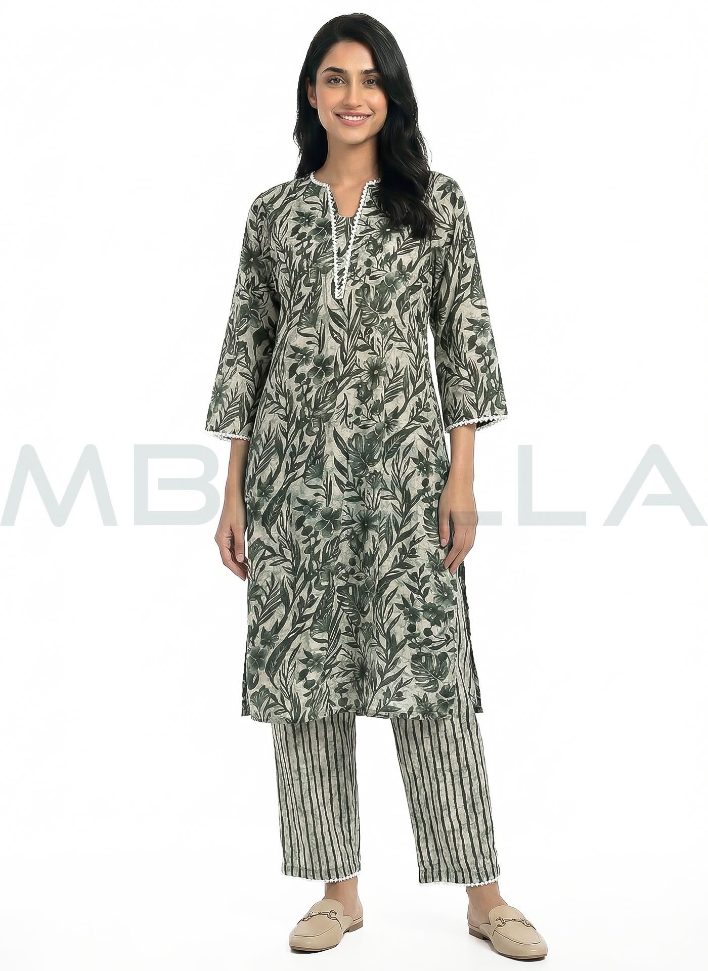 Evoking the lush, untamed landscapes of the Indian subcontinent, this exquisite two-piece ensemble is a masterclass in the heritage of hand-block printing. Drawing profound inspiration from the 12th-century Sanganeri craft traditions of Rajasthan, the kurta features a dense, verdant botanical tapestry that celebrates the ‘Buti’ and ‘Jaal’ motifs synonymous with royal garden aesthetics. The fabric is a premium, breathable cotton-silk blend, offering a soft luster that feels like a second skin while maintaining a crisp, regal structure suitable for day-long festivities. Artisanal attention is evident in the delicate ‘Chikankari-inspired’ crochet lace trimmings that adorn the split V-neckline and the sleeve cuffs, adding a touch of vintage femininity to the structured silhouette. The kurta is expertly tailored into a classic straight-cut frame with elegant side slits, ensuring effortless movement during grand celebrations. Complementing the intricate floral top is a pair of straight-leg trousers featuring a rhythmic vertical stripe pattern—a sophisticated nod to the ‘Leheriya’ heritage—creating a visual contrast that elongates the frame. For a grand festive occasion such as an afternoon Mehndi or a vibrant Eid brunch, style this ensemble with oversized oxidized silver Jhumkas and hand-crafted leather Khussa shoes. Draping a sheer organza dupatta with scalloped edges over one shoulder will further elevate the look to one of timeless grace. This set is not merely a garment; it is a wearable piece of history, meticulously designed for the modern woman who cherishes her roots while embracing contemporary elegance. The interplay of deep forest greens and ivory tones ensures you stand out with a sophisticated, earthy charm that is both refreshing and deeply traditional.
