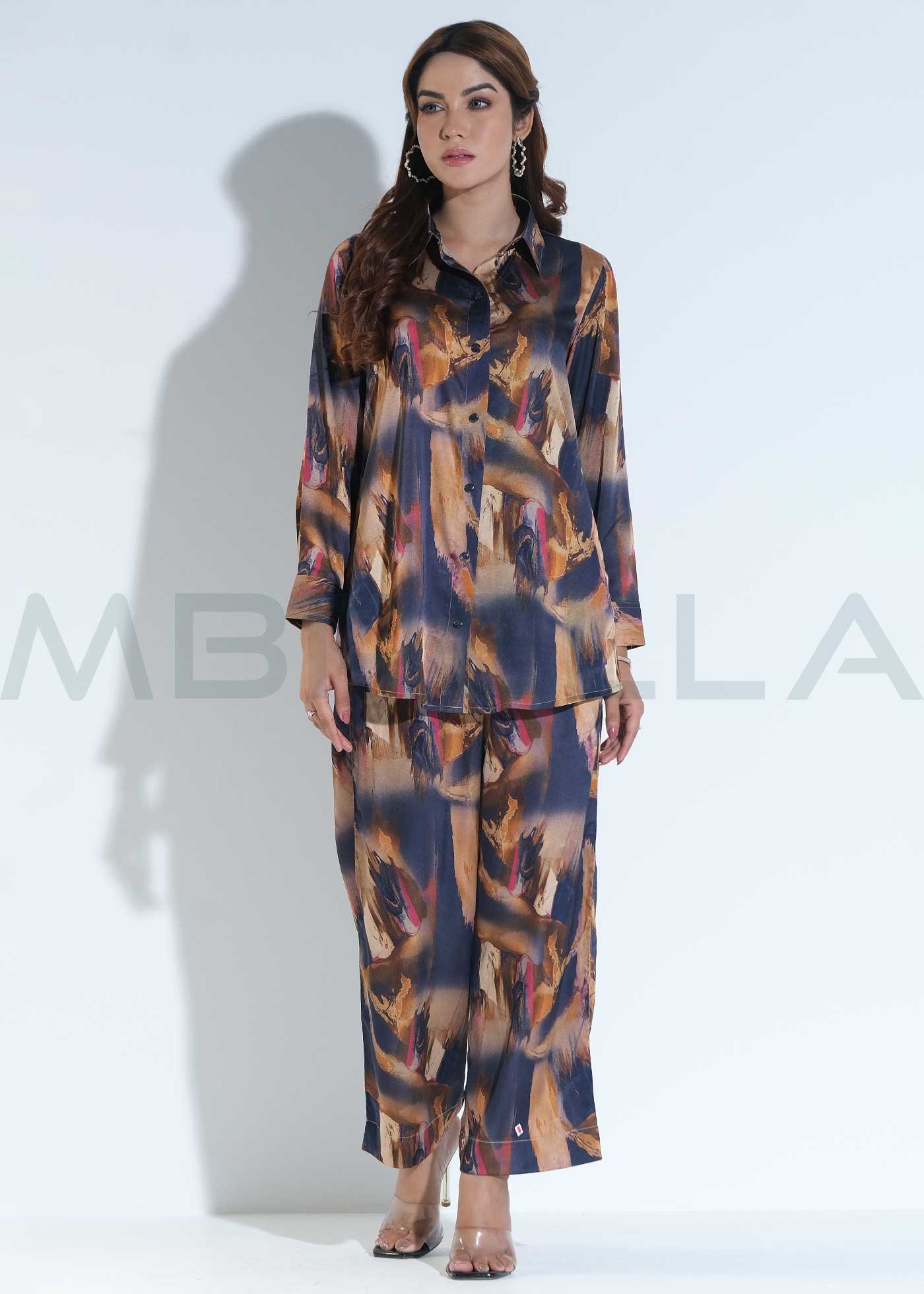 Embrace the intersection of contemporary art and traditional luxury with our Midnight Ochre Abstract 2-Piece Set. This ensemble is a testament to the modern South Asian woman’s wardrobe, where heritage meets the high-fashion avant-garde. The fabric is a premium, high-luster silk-satin that mimics the fluid movement of the Indus River, offering a cool, tactile sensation against the skin. The print itself is a masterpiece of digital artistry, featuring bold, expressionist brushstrokes in deep navy, burnt sienna, and golden sand—colors that evoke the twilight over the Thar Desert. The silhouette is meticulously tailored to provide a relaxed yet structured look; the shirt features a classic pointed collar and a streamlined button-down front, while the trousers are cut with a sophisticated wide-leg flare that elongates the frame. This set pays homage to the ‘Karkhanas’ of old, where artists were commissioned to create bespoke textiles for the elite, now reimagined for the global stage. For a grand festive brunch or an upscale gallery opening, style this set with oversized gold architectural hoops and sleek, transparent stiletto sandals to keep the focus on the vibrant print. A slicked-back bun and a bold berry lip will complete this look of effortless opulence. Whether you are hosting an intimate soirée or attending a destination wedding event, this 2-piece set ensures you remain the focal point of every room, bridging the gap between historical craftsmanship and futuristic design, ensuring comfort without ever sacrificing the regal aesthetic expected of luxury South Asian fashion.