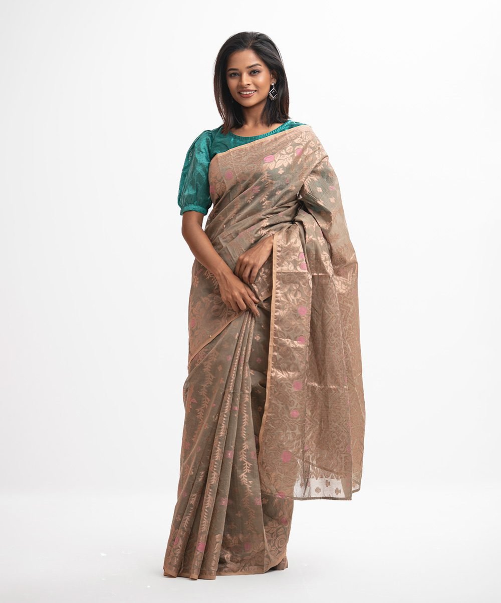 Embrace a palette of understated opulence with our Light Brown Half-silk Saree, a garment that reimagines traditional handloom aesthetics for the modern connoisseur. This piece draws inspiration from the earthy tones of the subcontinental landscape, elevated by the luminous sheen of high-quality silk fibers blended with soft cotton. The heritage of this weave lies in the fusion of Banarasi-inspired motifs with the lightweight versatility of Bengal looms, offering a garment that is as comfortable as it is regal. The body of the saree is punctuated by vibrant pink floral ‘butas’ and intricate beige-gold patterns that emerge from the fabric like a delicate tapestry. Each motif is a testament to the weaver’s precision, requiring hours of manual labor to achieve the perfect symmetry and depth. The texture is gossamer-thin yet durable, providing a sheer, sophisticated look that layers beautifully. When draped, the saree falls into elegant, structured pleats, while the pallu showcases a dense concentration of artisanal work that adds weight and grace to your silhouette. For a grand festive evening or an engagement party, pair this saree with a contrasting jewel-toned blouse, such as emerald green or deep ruby, to create a striking visual contrast. Accessorize with heavy oxidized silver jhumkas or a statement choker to lean into a bohemian-luxe vibe. The meticulous placement of the pink floral accents ensures that the saree glows under evening lights, making it a standout choice for celebrations where tradition meets high fashion.