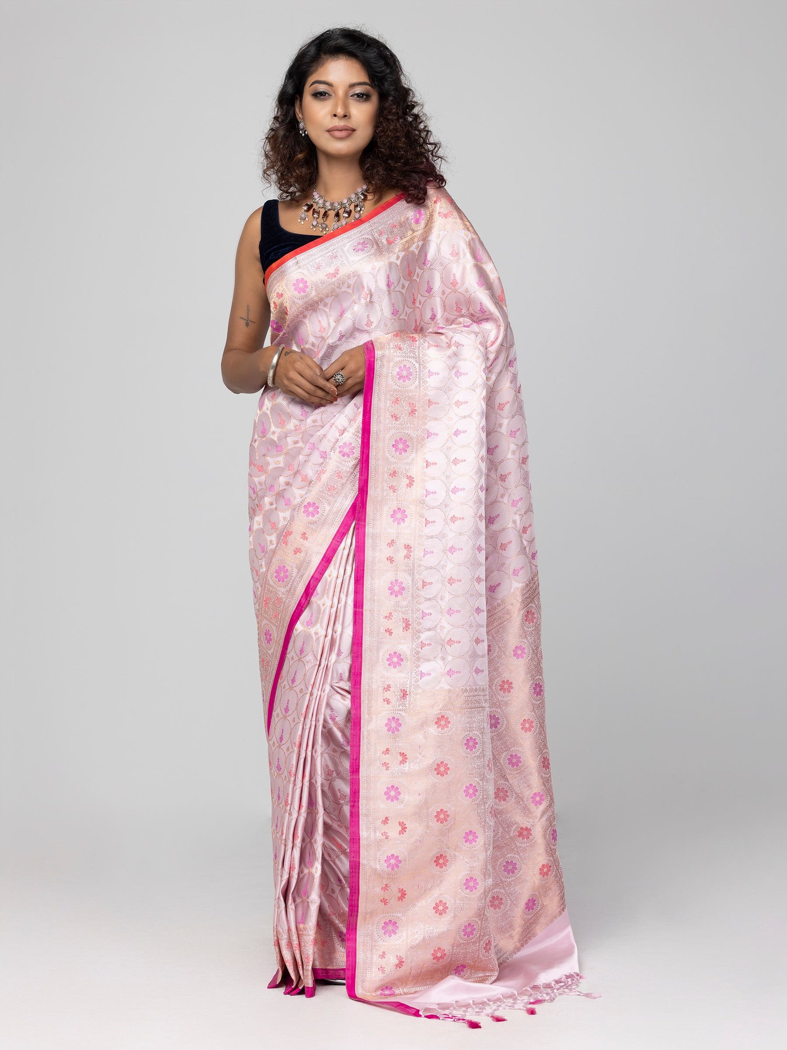 Experience the ethereal charm of the Light Pink Mirpur Katan Saree, a garment that serves as a canvas for one of the most storied weaving traditions in South Asia. Originating from the bustling looms of Mirpur, this craft is a testament to the cultural exchange between Persian aesthetics and Bengali craftsmanship. The Katan silk used here is of the finest quality, characterized by its high density and a subtle, pearlescent sheen that only pure silk can provide. Every inch of this saree is a labor of love; the body is intricately woven with a ‘floral jaal’—a trellis-like pattern—using shimmering zari threads that mimic the delicate appearance of silver filigree. The texture is smooth yet substantial, allowing for a drape that is both fluid and regal. The border is finished with a striking magenta silk binding, adding a sharp, modern definition to the pastel palette. This saree is perfect for grand daytime celebrations such as a Nikkah, an engagement, or a high-profile spring wedding. To style this masterpiece, opt for a sleeveless velvet blouse in a contrasting navy or deep purple as seen here to make the pink pop, and accessorize with a heavy Polki necklace and statement rings. The silhouette is designed to accentuate the wearer’s grace, with a heavy pallu that cascades beautifully over the arm, showcasing the dense, artisanal hand-work. The structured nature of the Katan silk ensures that the pleats remain crisp and perfectly aligned, providing a slimming effect while maintaining a grand flare at the base. Whether you are walking down the aisle or attending a festive gala, this Mirpur Katan Saree promises an aura of sophisticated opulence that transcends fleeting fashion trends.