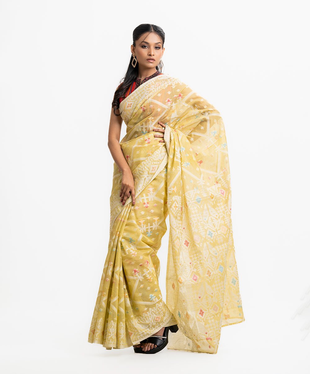 Radiate ethereal charm in our Lime Half-silk Saree, a garment that captures the essence of a sun-drenched garden. This piece is a contemporary tribute to the legendary Muslin and Jamdani traditions, where the interplay of light and shadow through translucent fabric creates a mesmerizing effect. The half-silk composition provides a delicate, airy feel, making it an ideal choice for daytime festivities like a Haldi ceremony or a spring wedding. The lime-yellow hue is fresh and revitalizing, adorned with delicate ‘karigari’ featuring pastel floral sprigs in soft pink, sky blue, and tangerine. These motifs are not merely printed but are intricately hand-woven into the fabric, showcasing the ‘Panna Hazara’ style where a thousand tiny details come to life. The silhouette is designed for effortless elegance; the fabric’s inherent stiffness allows for a structural drape that flatters all body types, while the sheer ‘pallu’ adds a layer of mystery and sophistication. The borders are finished with geometric precision, framing the wearer in a halo of artisanal excellence. To complete the look for a grand occasion, pair this saree with kundan earrings and a choker set. Opt for a sleek back-bun adorned with fresh jasmine to mirror the floral themes of the weave. This saree isn’t just an outfit; it’s a piece of wearable art that celebrates the resilience and beauty of South Asian handloom heritage, ensuring you stand out with understated luxury and a vibrant, youthful energy that is perfect for the modern festive wardrobe.