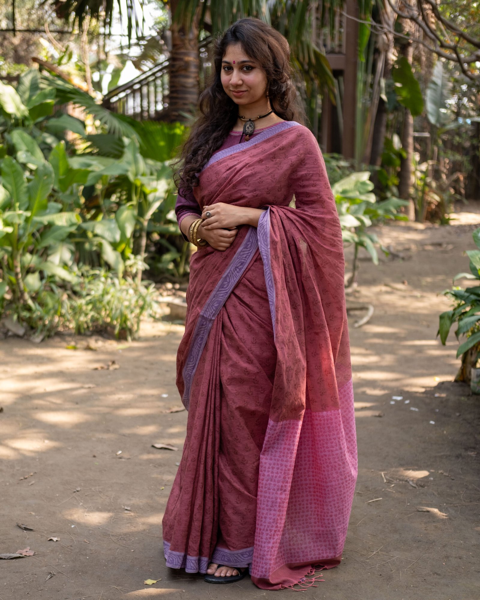 The ‘Lolita’ saree is a poetic ode to the understated elegance of South Asian handloom traditions, specifically drawing inspiration from the serene landscapes of West Bengal. Rooted in the rich textile heritage of the region, this piece is meticulously crafted from premium hand-spun cotton, a fabric celebrated for centuries for its breathability, durability, and graceful aging process. The ‘Lolita’ features a sophisticated and unusual color palette of dusty rose and muted mauve, punctuated by a striking lavender-toned border that frames the silhouette with architectural precision. The artisanal hand-block printing technique employed here is a labor of love; each motif is stamped onto the fabric using hand-carved teak wood blocks dipped in natural pigments, ensuring that no two pieces are truly identical. The texture is soft yet holds a certain structure, offering a tactile experience that only genuine hand-loomed textiles can provide. The pallu transitions into a vibrant rose-pink hue, adorned with intricate geometric patterns that add a contemporary flair to the traditional six-yard drape. For a grand festive occasion or a daytime wedding, style the ‘Lolita’ with a contrasting deep purple blouse and antique silver oxidized jewelry to highlight its earthy tones. The drape should be kept classic—a traditional Nivi style—to allow the delicate transitions of color and the fine Jamdani-inspired weave of the border to take center stage. This saree is not just a garment; it is a testament to the enduring legacy of the weaver’s loom, designed for the modern woman who carries history with a sense of effortless poise. Its lightweight nature ensures a beautiful flare at the pleats, while the crisp border ensures the drape remains sharp and regal throughout the day’s festivities.