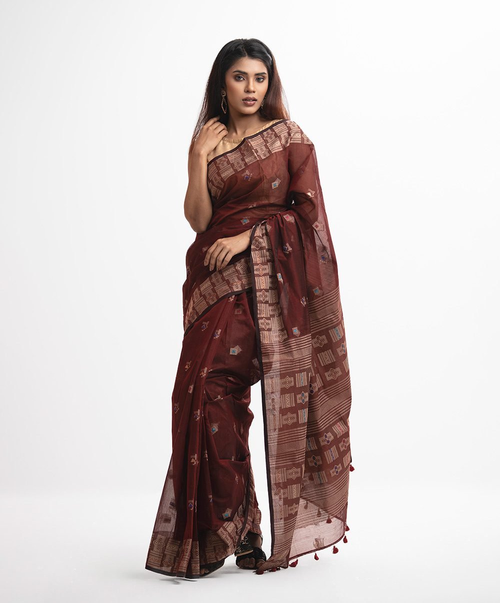 Step into a realm of timeless elegance with our Maroon Half-silk Saree, a masterpiece that pays homage to the centuries-old weaving traditions of the Bengal region. This saree is a soulful rendition of the classic Jamdani aesthetic, where every motif is a whisper of history and artisanal pride. The rich, deep maroon hue serves as a regal canvas for intricate geometric patterns, reminiscent of the architectural marvels of the Mughal era. Crafted from a refined blend of premium silk and cotton—commonly known as ‘half-silk’—the fabric offers the ethereal translucency of fine muslin with the sophisticated luster of silk. This unique texture ensures the saree is lightweight enough for a summer wedding yet maintains a structured drape that stays impeccable throughout the festivities. The artisanal hand-work is evident in the meticulously placed ‘butis’ and the ornate border that frames the silhouette with mathematical precision. The pallu is a vision of craftsmanship, featuring dense patterns and finished with delicate hand-tied tassels that add a rhythmic movement to your walk. For a grand wedding reception or a festive evening, style this saree with a sleeveless gold tissue blouse to highlight the deep maroon tones. Complement the look with heirloom temple jewelry or heavy gold jhumkas, and opt for a classic low bun adorned with fresh jasmine. The silhouette is designed to flatter, with the crispness of the fabric allowing for sharp, defined pleats at the waist and a fluid, sweeping fall over the shoulder. This saree is not just a garment; it is a piece of wearable art that bridges the gap between ancient heritage and modern luxury.