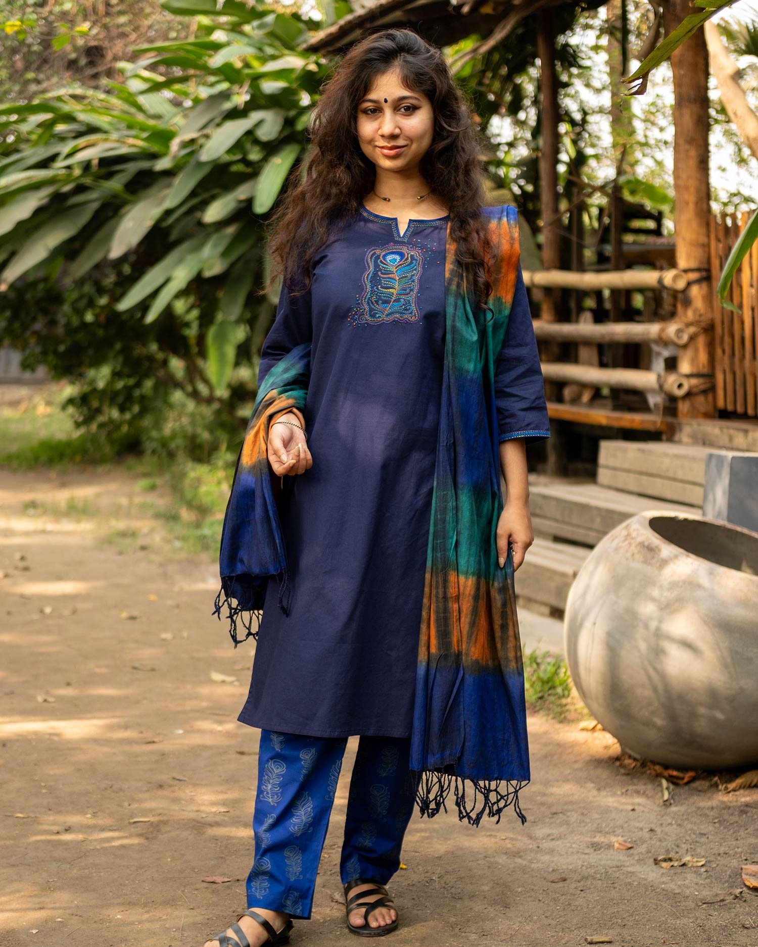 The Moyurakkhi-01 Salwar Kameez is a breathtaking tribute to the ‘Moyur,’ the regal peacock, which has served as a symbol of grace, royalty, and beauty in South Asian heritage for millennia. This ensemble is drenched in a deep, midnight indigo, a color traditionally achieved through natural dyeing processes that have been passed down through generations of master dyers. The focal point of the kameez is an exquisitely embroidered peacock feather motif on the chest, rendered in vibrant shades of turquoise, amber, and emerald. This hand-work utilizes fine Resham threads and subtle beadwork to capture the iridescent quality of a real feather, framed by a delicate border that accentuates the neckline. The fabric is a premium handloom cotton-silk blend, providing a soft luster that catches the light during evening festivities. The trousers are adorned with repeating peacock feather prints in a lighter cerulean blue, creating a harmonious visual rhythm from head to toe. The dupatta is a standout element, featuring a bold, multi-colored tie-dye technique reminiscent of the ancient Bandhani or Shibori traditions. The transition from fiery orange to deep forest green across the indigo fabric adds a dramatic flair to the ensemble. For a grand wedding reception or a cultural festival, pair the Moyurakkhi-01 with heavy silver oxidized jhumkas and a statement ring. Let your hair fall in soft, natural curls to mirror the fluid patterns of the dupatta. The silhouette is a classic straight-cut kameez with a contemporary V-split neckline, designed to offer a regal stature and a comfortable, airy fit that moves with the wearer’s every step.
