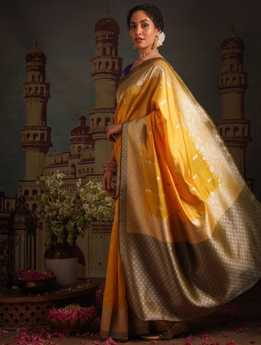 Embrace the regal aura of the ‘Eternal City’ with our Mustard Yellow Silk Banarasi Woven Saree, a masterpiece that traces its lineage back to the opulent Mughal era. For centuries, the master weavers of Varanasi have intertwined gold and silver threads with pure silk to create textiles fit for royalty. This saree is crafted from the finest Katan silk, offering a rich, lustrous sheen and a structured drape that epitomizes South Asian luxury. The fabric feels substantial yet supple, moving with a rhythmic grace as you walk. The body is adorned with meticulously hand-woven ‘Butis’—delicate floral motifs created using the ‘Kadwa’ technique, where each motif is woven individually into the silk, ensuring no loose threads on the reverse. The highlight of this piece is its grand ‘Pallu,’ featuring an architectural ‘Jhaal’ pattern inspired by the intricate stone carvings and floral parchin kari of ancient Indian palaces. The heavy Zari border provides a majestic frame, ensuring the silhouette remains poised and dignified. For a grand wedding ceremony or a vibrant Haldi celebration, style this saree with an antique gold choker set and a stack of kundan bangles. Drape the pallu in a traditional ‘seedha pallu’ or a classic over-the-shoulder style to showcase the heavy embroidery and the radiant mustard hue. Complete the look with a fresh gajra of jasmine flowers in your hair and a deep vermilion bindi, channeling a timeless elegance that transcends generations. This is not just a garment; it is an heirloom piece, a testament to the unparalleled skill of the Banarasi ‘Karigars’ who spend weeks on a single loom to bring such opulence to life.