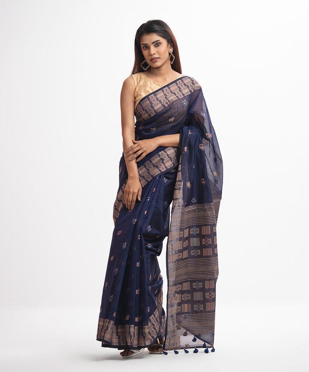 Step into the spotlight with our Navy Blue Half-silk Saree, a sartorial symphony that blends the regal luster of silk with the effortless breathability of fine cotton. This garment is a contemporary tribute to the weaving clusters of Bengal, where the ‘half-silk’ or ‘semi-silk’ technique was perfected to provide the opulence of a wedding saree without the heavy weight. The deep, midnight navy hue serves as a sophisticated canvas for the intricate geometric and architectural motifs that adorn the borders and the pallu. These patterns, inspired by ancient temple carvings, are rendered in a soft copper-gold zari that catches the light with every movement, creating a mesmerizing ‘dhup-chhaon’ (light and shadow) effect. The texture is uniquely tactile—smooth and shimmering across the silk threads, yet grounded by the matte finish of the cotton. The pallu is finished with playful, hand-knotted tassels that add a touch of modern whimsy to the traditional silhouette. This saree is engineered to hold its shape beautifully, offering a sharp, defined flare at the bottom and a structured drape over the shoulder. For a grand evening reception or a festive Diwali gala, pair this ensemble with statement gold ‘chandbalis,’ a stack of metallic bangles, and a bronzed makeup look. The dark palette provides the perfect backdrop for a sleeveless gold tissue blouse or a high-neck velvet bodice, ensuring you remain the focal point of any celebratory gathering while honoring the rich lineage of South Asian handloom.