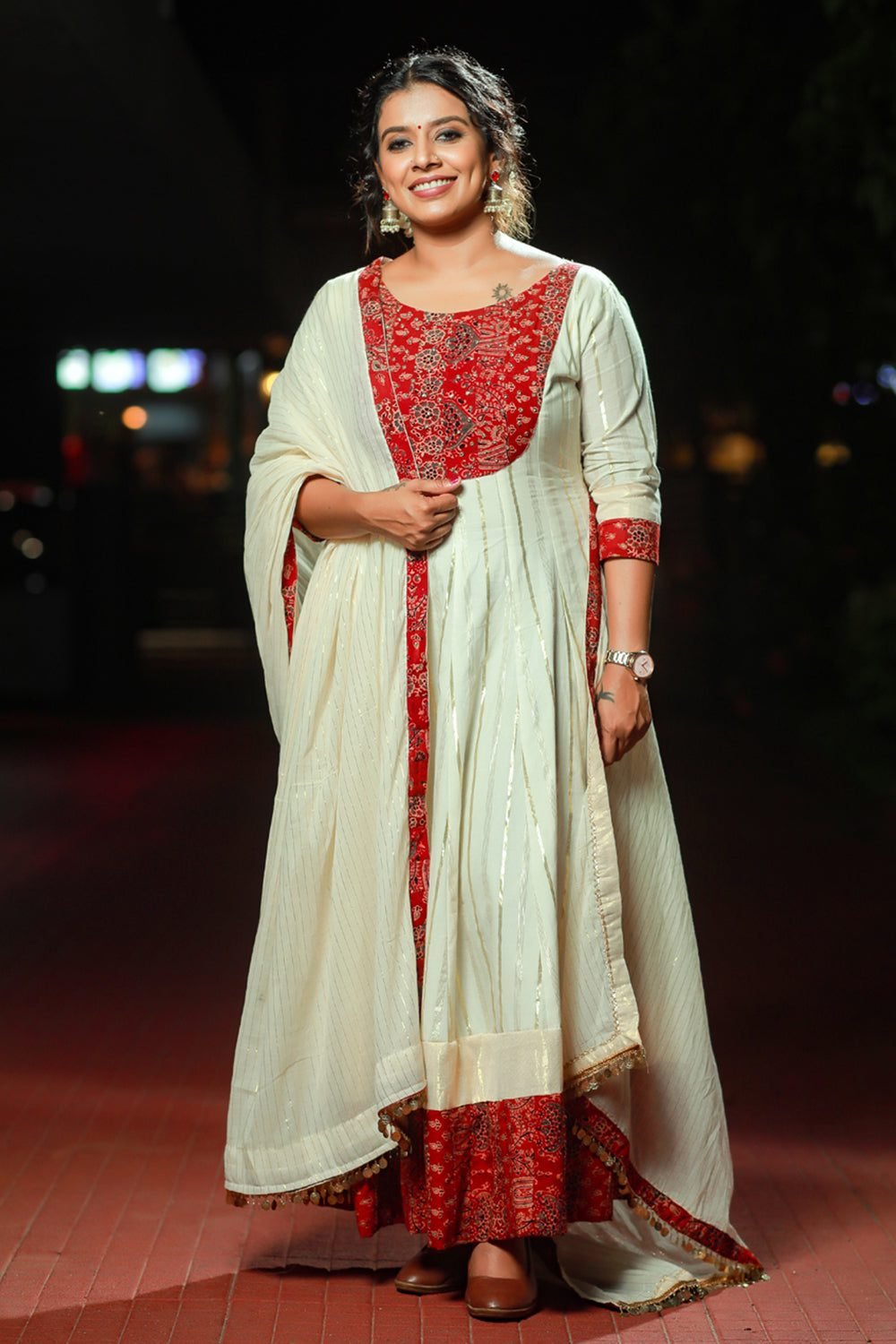 Step into a realm of timeless elegance with our Off-white Anarkali, a masterpiece that harmoniously blends the ethereal grace of Mughal-inspired silhouettes with the rugged, storied heritage of Ajrakh craft. The Anarkali, a silhouette that traces its origins back to the grand courts of the Mughal Empire, is celebrated here in a luminous off-white canvas. The body of the garment is meticulously crafted from premium fabric featuring delicate vertical gold zari stripes, which provide a subtle shimmer and an elongated, regal stature to the wearer. The piece de resistance is the striking yoke, featuring a deep madder-red Ajrakh patch. Ajrakh, a 3,000-year-old craft rooted in the Indus Valley Civilization, involves a complex sixteen-step process of resist-dyeing and hand-block printing using natural minerals and vegetable dyes. This heritage craft brings a sense of grounded history to the garment’s ethereal aesthetic. The silhouette is a classic Kalidar construction, where multiple panels flare out from a structured waist to create a magnificent, sweeping volume that dances with every step. The hemline is weighted with a broad Ajrakh border and finished with artisanal coin-fringe detailing that adds a rhythmic chime to your movement. For a grand wedding or a festive Diwali gala, style this ensemble with heirloom gold jhumkas, a statement maang-tika, and a sleek low bun adorned with fresh jasmine. The accompanying dupatta, draped over one shoulder, completes this vision of South Asian luxury, making it a perfect choice for the modern woman who carries history in her stride.