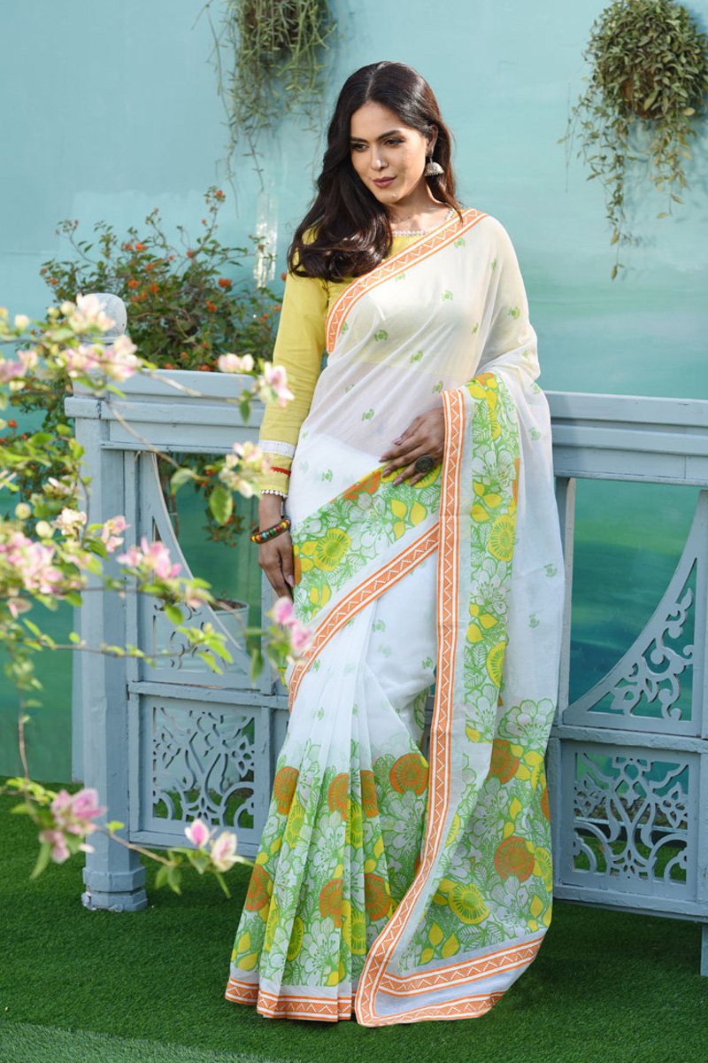 Evoke the ethereal charm of a sun-drenched morning with our Off White Cotton Printed Saree, a masterpiece that pays homage to the centuries-old legacy of artisanal cotton weaving in South Asia. Historically, fine cotton has been the canvas for the most intricate expressions of Indian craftsmanship, cherished for its breathability and regal simplicity. This particular piece features a pristine off-white base, meticulously crafted from the finest yarns to ensure a texture that is both soft against the skin and structurally sound for a flawless drape. The saree is adorned with vibrant lime green and zesty orange floral motifs, reminiscent of the lush gardens of the Deccan. These patterns are applied with a precision that speaks to the heritage of block-printing techniques, where every petal is a testament to the artisan’s steady hand. The border is a striking geometric interplay of orange and white, framing the silhouette with a modern architectural edge. For a grand daytime occasion such as a Haldi ceremony or a spring festival, style this saree with a mustard or lemon-yellow long-sleeved blouse to accentuate the citrus tones. Accessorize with oversized silver jhumkas and a stack of colorful bangles to complete the look. The silhouette is designed for effortless elegance; when draped in the classic Nivi style, the saree offers a generous flare at the pleats, while the lightweight fabric allows the pallu to fall gracefully over the shoulder, showcasing the intricate print placement that transitions from delicate scattered blossoms to a concentrated, festive border. It is more than a garment; it is a breathable piece of history, reimagined for the contemporary woman who values both comfort and couture.