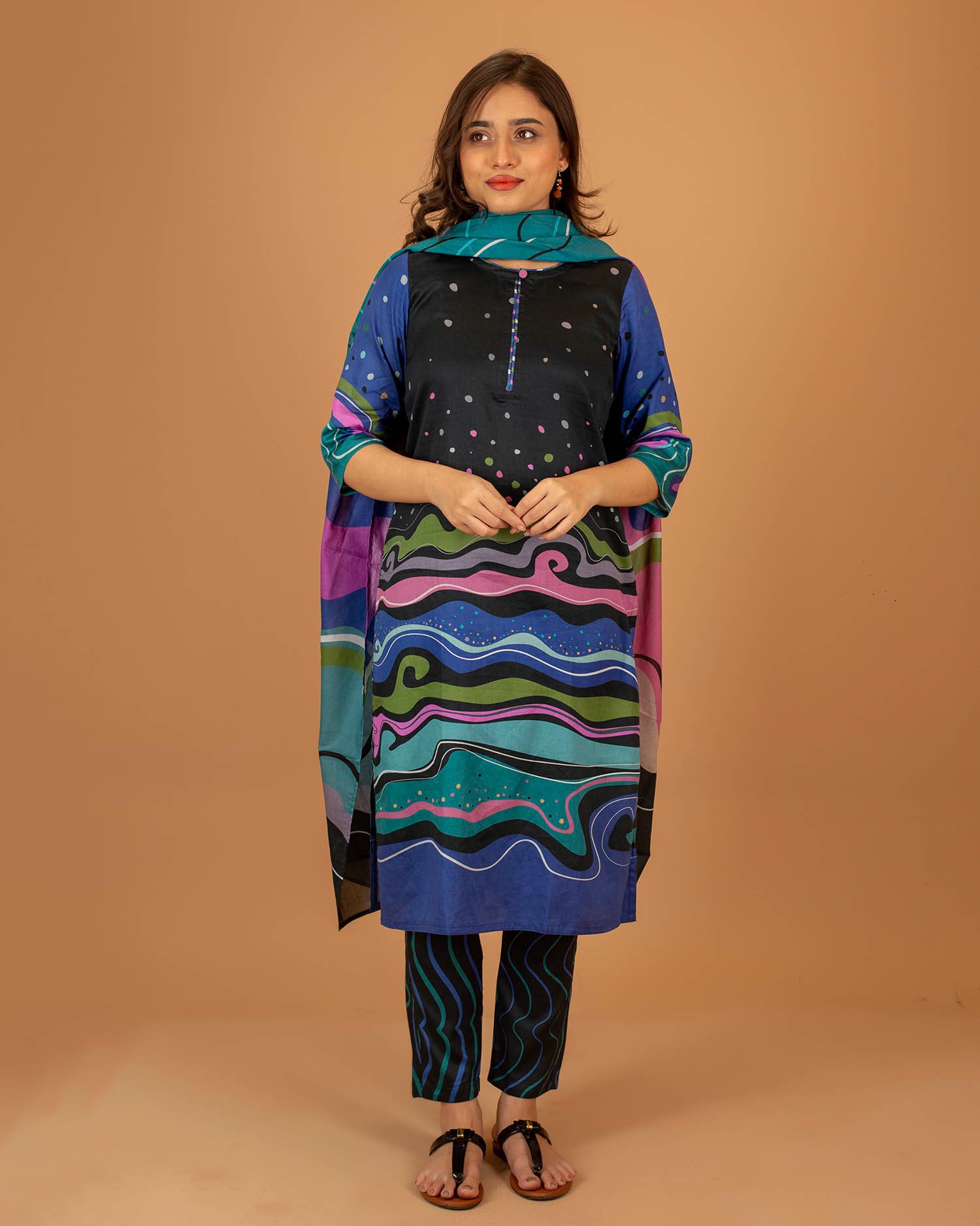 Step into a world where tradition meets avant-garde artistry with the ‘Ostoraag’ Salwar Kameez, a masterpiece that pays homage to the vibrant heritage of South Asian textile arts. This ensemble is a celebration of the ‘Ostoraag’ or sunset glow, capturing the transition of light through its meticulously curated color palette. The kameez features a sophisticated midnight black base, meticulously adorned with a celestial shower of multi-colored polka dots that evoke the whimsical charm of a starlit sky. As the gaze moves downward, the silhouette transforms into a canvas of fluid, hand-painted waves in shades of emerald green, royal blue, amethyst purple, and fuchsia, reminiscent of the traditional ‘Batik’ techniques refined over centuries in the Bengal region. The fabric, a luxurious blend of fine silk and cotton, offers a soft, luminous texture that feels like a second skin while maintaining a regal structure. The straight-cut kameez is paired with sleek, tailored trousers featuring rhythmic wavy patterns, creating a cohesive visual flow. The ensemble is completed with a deep teal dupatta, bordered with abstract motifs that dance with every movement. For a grand wedding reception or a festive gala, style this look with oversized silver ‘Chandbalis’ and a sleek low bun. The artisanal hand-work on the placket adds a touch of subtle opulence, making it a perfect choice for the modern connoisseur who values heritage but embraces contemporary flair. Whether you are attending a Mehendi ceremony or an evening soirée, the Ostoraag ensures you are draped in a narrative of elegance and artistic rebellion.
