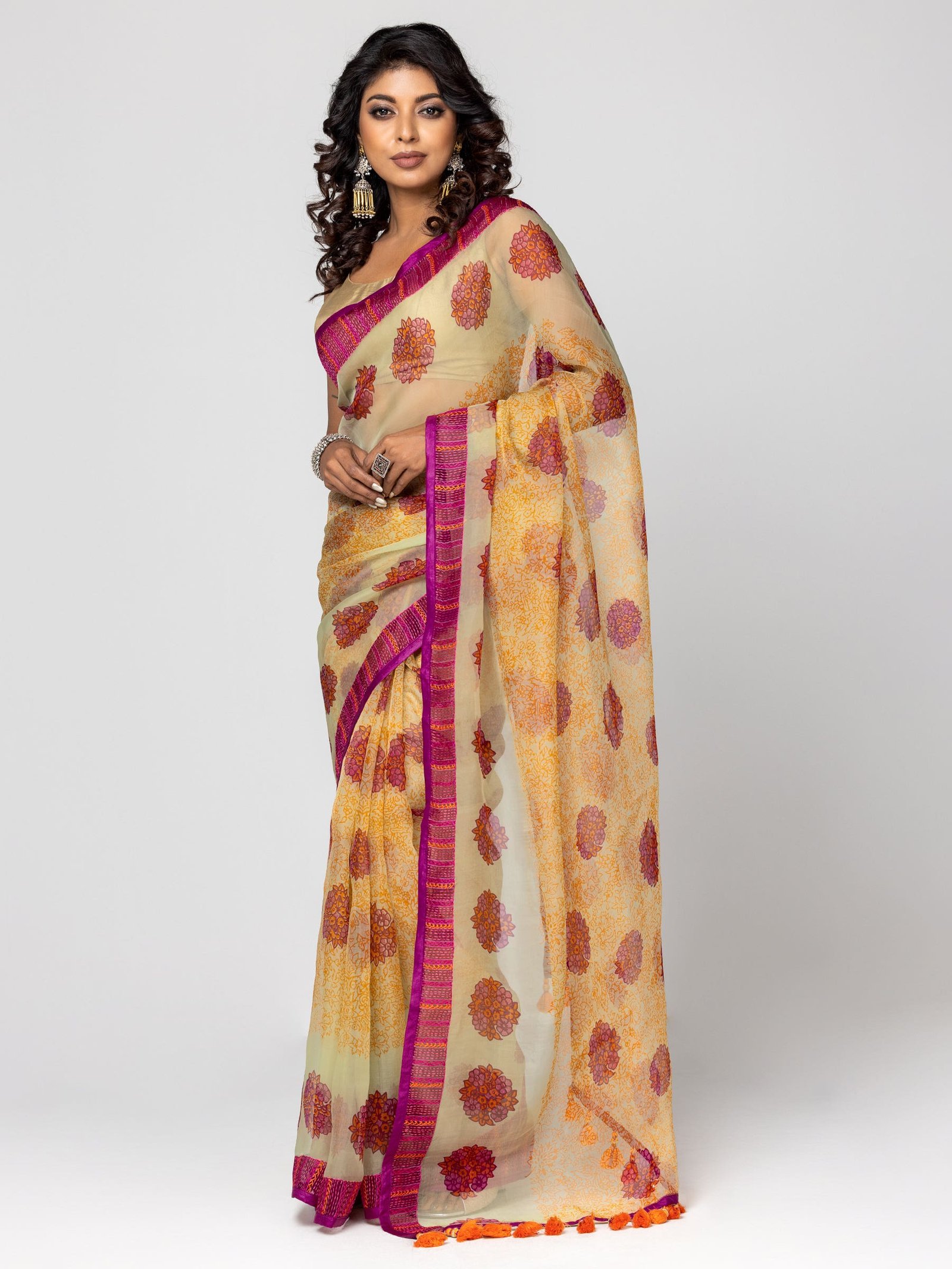 Step into a realm of ethereal grace with our Pale Yellow and Mint Green Printed Muslin Saree, a masterpiece that pays homage to the ‘woven air’ of ancient Bengal. Historically, Muslin was the fabric of royalty, celebrated for its unparalleled fineness and gossamer-like transparency that once captivated the Mughal courts. This contemporary iteration features a delicate interplay of pale yellow and soft mint green hues, creating a refreshing palette perfect for daylight festivities. The body is adorned with intricate floral prints that evoke the charm of a spring garden, while the borders are defined by a striking magenta band enriched with rhythmic artisanal embroidery. The texture is incredibly lightweight and breathable, offering a fluid drape that moves with a poetic softness. Each edge is finished with playful orange tassels that add a touch of bohemian luxury to the traditional silhouette. For a grand wedding ceremony or a high-profile garden party, drape this saree in the classic Nivi style to showcase the diaphanous quality of the pallu. Complement the vibrant magenta border with a gold-toned sleeveless blouse and traditional kundan jhumkas. To enhance the ensemble’s heritage appeal, style your hair in a low, textured bun adorned with fresh jasmine or marigolds, ensuring you embody the timeless sophistication of South Asian craftsmanship while remaining effortlessly comfortable throughout the event.